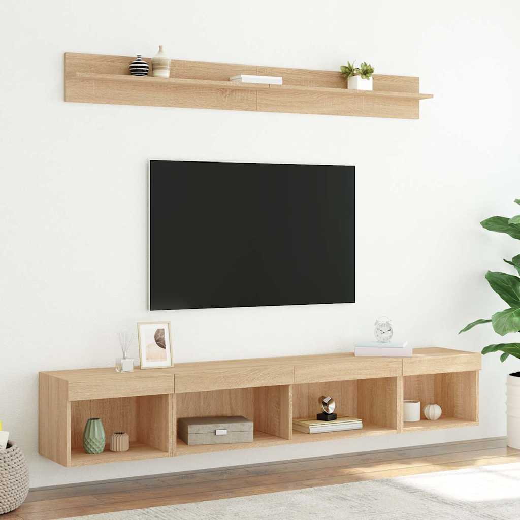 Diese TV-Wandschränke bieten eine perfekte Lösung, um zusätzlichen Stauraum in deinem Wohnraum zu schaffen und für Ordnung zu sorgen. Robustes Material: Holzwerkstoff ist ein Material von außergewöhnlicher Qualität mit glatter Oberfläche, das sich durch Festigkeit, Stabilität und Feuchtigkeitsbeständigkeit auszeichnet.RGB-LED-Leuchten: Die Wohnwand ist mit lebendigen RGB-LED-Leuchten ausgestattet. Mit verschiedenen anpassbaren Menüs kannst du die Farbe der Lichter mühelos wechseln und sie sogar auf automatische Anpassung einstellen. Diese LED-Leuchten unterstreichen nicht nur den modernen Look des TV-Wandschranks, sondern tragen auch zu seiner trendigen Optik bei.Wandmontage: Der TV-Schrank lässt sich an der Wand montieren, um zusätzlichen Stauraum zu schaffen. Auf diese Weise kannst du deine Bodenfläche maximieren und für Ordnung im Raum sorgen.Reichlich Stauraum: Das TV-Wandschrank-Set bietet reichlich Platz, um Bücher, DVDs, Zeitschriften, Medien und andere Alltagsgegenstände übersichtlich und griffbereit zu verstauen.Vielseitiges Design: Du kannst den Schrank als TV-Schrank verwenden oder ihn im Arbeitszimmer an der Wand montieren, um Utensilien oder andere Gegenstände bequem aufzubewahren. Zudem verwandelt er eine leere Wand sofort in ein Design-Element. Gut zu wissen:Schrauben und Dübel für die Innenseite der Wand sind nicht enthalten. Wir empfehlen dir, Schrauben und Dübel zu finden und zu verwenden, die speziell für deine Wände geeignet sind. Wenn du dir nicht sicher bist, kannst du dich an einen Fachmann wenden. Bitte lies und befolge jeden Schritt in der Anleitung.Das Produkt verfügt über einen USB-Anschluss, für den eine zertifizierte 5V-USB-Stromquelle erforderlich ist (nicht im Lieferumfang enthalten).
