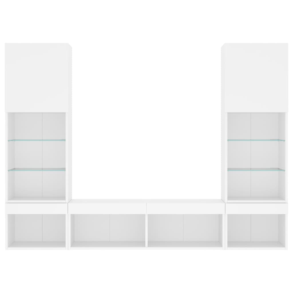 Diese TV-Wandschränke bieten eine perfekte Lösung, um zusätzlichen Stauraum in deinem Wohnraum zu schaffen und für Ordnung zu sorgen. Robustes Material: Holzwerkstoff ist ein Material von außergewöhnlicher Qualität mit glatter Oberfläche, das sich durch Festigkeit, Stabilität und Feuchtigkeitsbeständigkeit auszeichnet.RGB-LED-Leuchten: Die Wohnwand ist mit lebendigen RGB-LED-Leuchten ausgestattet. Mit verschiedenen anpassbaren Menüs kannst du die Farbe der Lichter mühelos wechseln und sie sogar auf automatische Anpassung einstellen. Diese LED-Leuchten unterstreichen nicht nur den modernen Look des TV-Wandschranks, sondern tragen auch zu seiner trendigen Optik bei.Wandmontage: Der TV-Schrank lässt sich an der Wand montieren, um zusätzlichen Stauraum zu schaffen. Auf diese Weise kannst du deine Bodenfläche maximieren und für Ordnung im Raum sorgen.Reichlich Stauraum: Das TV-Wandschrank-Set bietet reichlich Platz, um Bücher, DVDs, Zeitschriften, Medien und andere Alltagsgegenstände übersichtlich und griffbereit zu verstauen.Vielseitiges Design: Du kannst den Schrank als TV-Schrank verwenden oder ihn im Arbeitszimmer an der Wand montieren, um Utensilien oder andere Gegenstände bequem aufzubewahren. Zudem verwandelt er eine leere Wand sofort in ein Design-Element. Gut zu wissen:Schrauben und Dübel für die Innenseite der Wand sind nicht enthalten. Wir empfehlen dir, Schrauben und Dübel zu finden und zu verwenden, die speziell für deine Wände geeignet sind. Wenn du dir nicht sicher bist, kannst du dich an einen Fachmann wenden. Bitte lies und befolge jeden Schritt in der Anleitung.Das Produkt verfügt über einen USB-Anschluss, für den eine zertifizierte 5V-USB-Stromquelle erforderlich ist (nicht im Lieferumfang enthalten).