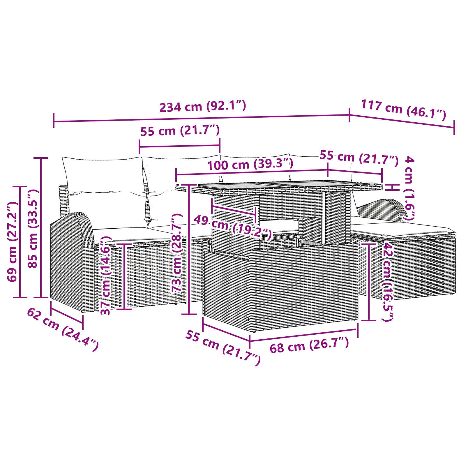 - Lieferumfang: 2 x Arm-Sofa mit Stauraumfunktion, 2 x Zentrale Sitze mit Stauraumfunktion, 1 x Fußhocker mit Stauraumfunktion, 1 x Gartentisch