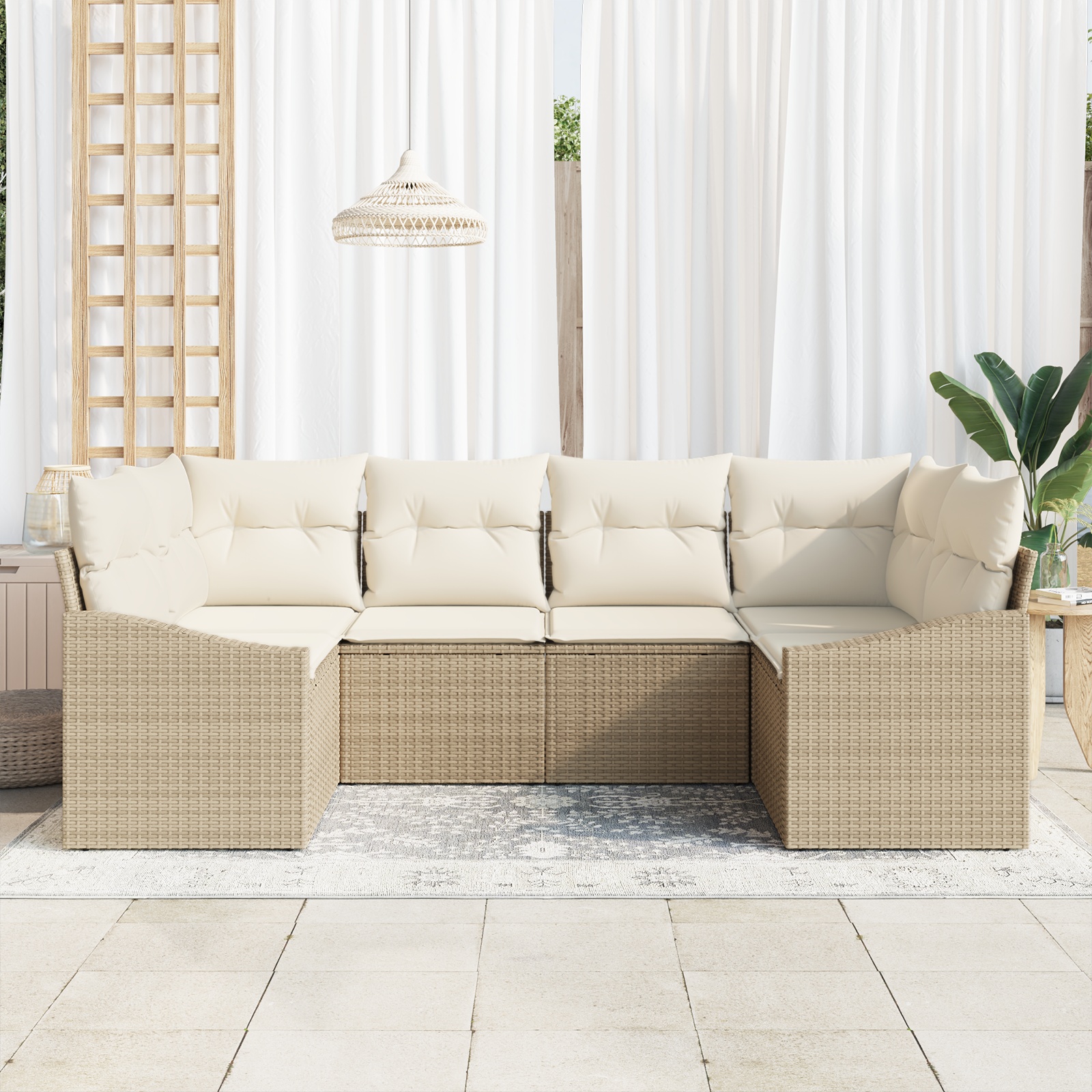 Das modulare Outdoor-Sektionen-Sofa bringt einen modernen Touch und jede Menge Flexibilität, schafft einen gemütlichen Platz für bis zu sechs Personen. Hergestellt aus robustem beigem Poly-Rattan und bequemen cremefarbenen Kissen, verwandelt es deine Außenbereiche und sonnigen Innenräume in perfekte Orte zum Entspannen und Feiern. Modulares Design: Diese clevere Form erlaubt es dir, deine Sitzbereiche perfekt für deinen Raum zu gestalten. Jedes Teil verbindet sich leicht oder kann auch einzeln verwendet werden und gibt dir viele Möglichkeiten. Haltbares Material: Hergestellt aus UV-beständigem und wasserdichtem Poly-Rattan, sieht dieses Garten-Sofa auch bei Wetterwechsel toll aus und ist super pflegeleicht. Es ist stark und stabil und bringt frischen Wind in dein Outdoor-Setup. Bequeme Kissen: Die kuscheligen Kissen sind echt bequem und haben abnehmbare Bezüge mit Reißverschlüssen zur einfachen Reinigung. Perfekt zum Relaxen, Essen oder einfach nur zum Chillen mit Freunden und Familie, geben diese Kissen deiner Outdoor-Sitzgelegenheit eine heimelige Note. Vielseitige Verwendung: Egal, ob du eine Gartenparty schmeißt, einen faulen Nachmittag genießt oder einfach einen gemütlichen Platz zum Entspannen suchst, dieses Sofa-Set deckt alle deine Outdoor-Bedürfnisse ab. Seine Vielseitigkeit macht es zu einer tollen Wahl für jeden Wohnraum und schafft einen entspannten Rückzugsort. Geräumige Sitzgelegenheiten: Mit großzügigen Dimensionen bietet dieses Sofa Platz für bis zu sechs Personen, perfekt für geselliges Beisammensein oder zum Relaxen. Die rechteckige Form macht es anpassungsfähig für diverse Anordnungen auf Terrassen oder im Garten.