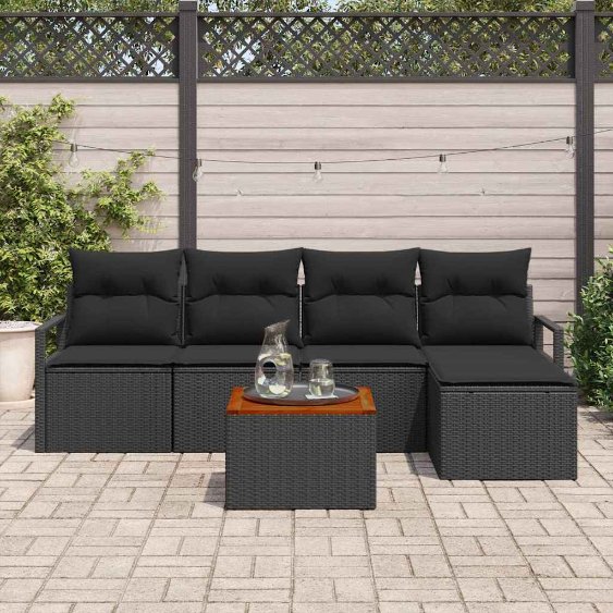 Dieses 6-teilige Garten-Sofa-Set ist stylisch und bequem, ideal für Außenwohnräume wie Balkone, Terrassen oder Gärten. Mit seinem schicken schwarzen Poly-Rattan und weichen Kissen wertet es deinen Außenbereich auf und bietet dir einen tollen Platz für Treffen oder ruhige Momente in der Sonne. Dieses Sofa-Set überzeugt mit handgewebtem Design aus robustem Poly-Rattan, was Langlebigkeit und gutes Aussehen garantiert. Es bietet modulare Arrangements für verschiedene Konfigurationen, ideal für gemütliche Balkone und große Gärten. Die verstellbaren Füße sorgen für Stabilität auf unebenem Untergrund und passen sich deinem Komfort an, was es perfekt für alle Arten von Außenbereichen macht. Dieses Sofa-Set ist wetterbeständig und behält Stil und Komfort auch bei schwierigen Wetterbedingungen. Für bis zu 5 Personen ausgelegt, ist es ideal für Familientreffen oder gesellige Beisammensein und sorgt für viel Freude bei jedem Außenevent.
