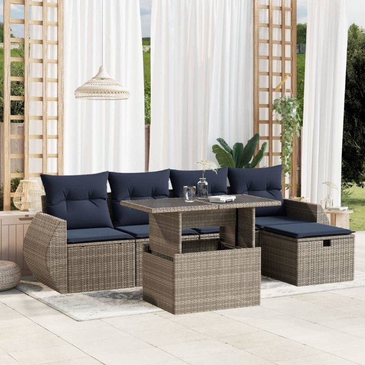 Dieses Gartensofa-Set ist die perfekte Ergänzung für Ihren Garten, Ihre Terrasse oder Ihren Innenhof und bietet einen komfortablen und einladenden Platz zum Plaudern mit Familie und Freunden oder einfach zum Entspannen und Genießen der Natur. Langlebiges Material: PE-Rattan, auch bekannt als Polyrattan, ist ein robustes, pflegeleichtes Kunststoffmaterial, das wie natürliches Rattan aussieht. Es ist leicht, einfach zu reinigen und wird aufgrund seiner Langlebigkeit und Wetterbeständigkeit häufig für Gartenmöbel verwendet.Verstellbare Tischplatte: Die Tischplatte kann angehoben werden, um den Tisch höher zu machen, wodurch der Gartentisch von einem Couchtisch in einen Esstisch verwandelt wird. Er eignet sich perfekt, um Gäste einzuladen oder draußen zu essen.Glastischplatte: Die Tischplatte des Gartentisches besteht aus starkem und langlebigem Hartglas, sodass sie sich leicht mit einem feuchten Tuch reinigen lässt und Ihrem Außenbereich einen Hauch von Eleganz verleiht.Abnehmbarer und waschbarer Bezug: Diese Sitzkissen verfügen über abnehmbare Bezüge, die sich leicht waschen und pflegen lassen.Modulares Design: Dieses Gartenmöbelset hat ein modulares Design, wodurch es völlig flexibel und leicht zu bewegen ist, sodass Sie eine individuelle Gartenmöbelanordnung erstellen können. Gut zu wissen:Damit Ihre Gartenmöbel schön bleiben, empfehlen wir Ihnen, sie mit einer wasserdichten Abdeckung zu schützen.