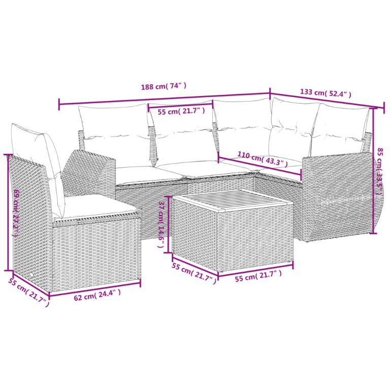 6-teiliges Gartensofa-Set mit Kissen, schwarzes Polyrattan