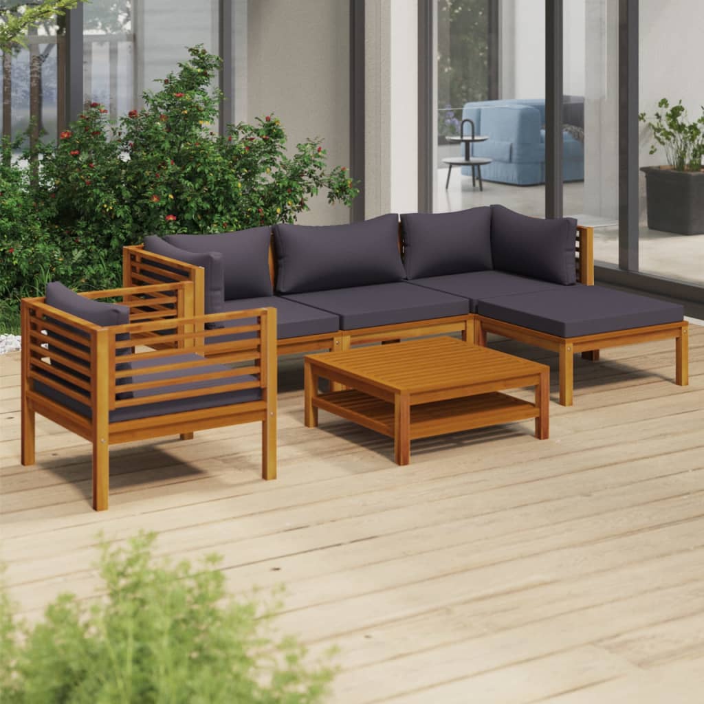 Dieses Lounge-Set aus Holz stellt eine perfekte Kombination aus Stil und Funktionalität dar. Auf dieser Sitzgruppe können Sie entspannende und beruhigende Momente mit Ihrer Familie und Freunden im Garten verbringen. Dank des massiven Akazienholzrahmens ist die Sofagarnitur stark, robust und langlebig; das mit Öl behandelte Holz macht dieses Gartenmöbel für den Außenbereich geeignet. Die abnehmbaren Kissen sind dick gepolstert, um einen hohen Sitzkomfort zu bieten. Ein Couchtisch mit einzigartigem Lattenrost-Design ist ebenfalls dabei. Dank des modularen Aufbaus können alle Teile nach Bedarf angeordnet und angepasst werden. Dieses Gartensofa wird sicherlich der Mittelpunkt Ihres Gartens oder Ihrer Terrasse sein. Hinweis: Um die Lebensdauer Ihrer Gartenmöbel zu verlängern, empfehlen wir Ihnen, diese regelmäßig zu reinigen und im Freien vor Niederschlägen oder starken Sonnenstrahlen zu schützen.Reinigung: Verwenden Sie eine milde SeifenlösungLagerung: Wenn möglich, an einem kühlen, trockenen Ort im Innenbereich lagern. Wenn das Produkt im Freien gelagert wird, schützen Sie es mit einer wasserdichten Abdeckung. Wischen und trocknen Sie das überschüssige Wasser oder den Schnee nach Regen oder Schneefall von ebenen Flächen. Sorgen Sie für eine ausreichende Luftzirkulation, um feuchtigkeitsbedingte Schäden zu vermeiden.