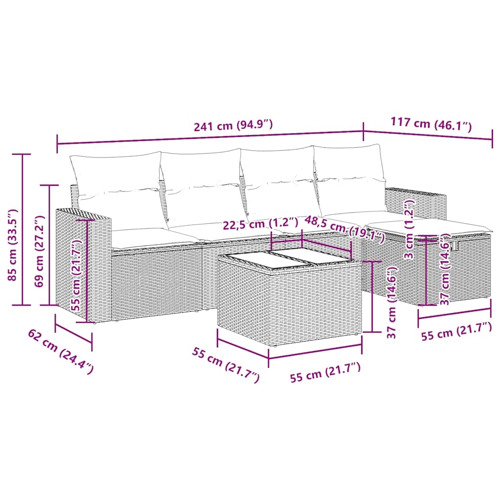 Diese Garten-Sofagarnitur ist die perfekte Ergänzung zu deinem Garten, deiner Terrasse oder deinem Innenhof. Sie bietet einen bequemen und einladenden Platz, um mit Familie und Freunden zu plaudern oder dich einfach nur zu entspannen und das Leben im Freien zu genießen. Langlebiges Material: PE-Rattan, auch als Poly Rattan bekannt, ist ein robustes, pflegeleichtes synthetisches Material, das die Optik von natürlichem Rattan aufweist. Es kennzeichnet sich durch ein geringes Eigengewicht und lässt sich einfach reinigen. Aufgrund seiner Haltbarkeit und Witterungsbeständigkeit wird es häufig bei der Herstellung von Gartenmöbeln verwendet.Stauraum mit wasserfestem Beutel: Jedes Gartensofa verfügt über ein Staufach unter der Sitzfläche, das mit einem wasserfesten Beutel zur Aufbewahrung von Kissen, Spielzeug und anderen Gegenständen versehen ist. Die Kissen sind mit Bezügen versehen und lassen sich mit Klettverschlüssen fest und sicher am Sofa befestigen.Vielseitiger Fußhocker: Der Hocker ist vielseitig einsetzbar und dient als bequeme Fußstütze beim Entspannen auf dem Sofa oder als zusätzlicher Sitzplatz in deinem Garten.Abnehmbarer und waschbarer Bezug: Diese Sitzkissen verfügen über abnehmbare Bezüge für einfaches Waschen und Pflegen.Robustes und stabiles Gestell: Der pulverbeschichtete Stahlgestell ist stark, stabil, langlebig sowie korrosions- und wetterbeständig, um eine lang anhaltende Leistung zu gewährleisten. Gut zu wissen:Wir empfehlen dir, deine Gartenmöbel mit einer wasserdichten Hülle zu schützen, um lange Zeit eine ansprechende Optik aufzuweisen.