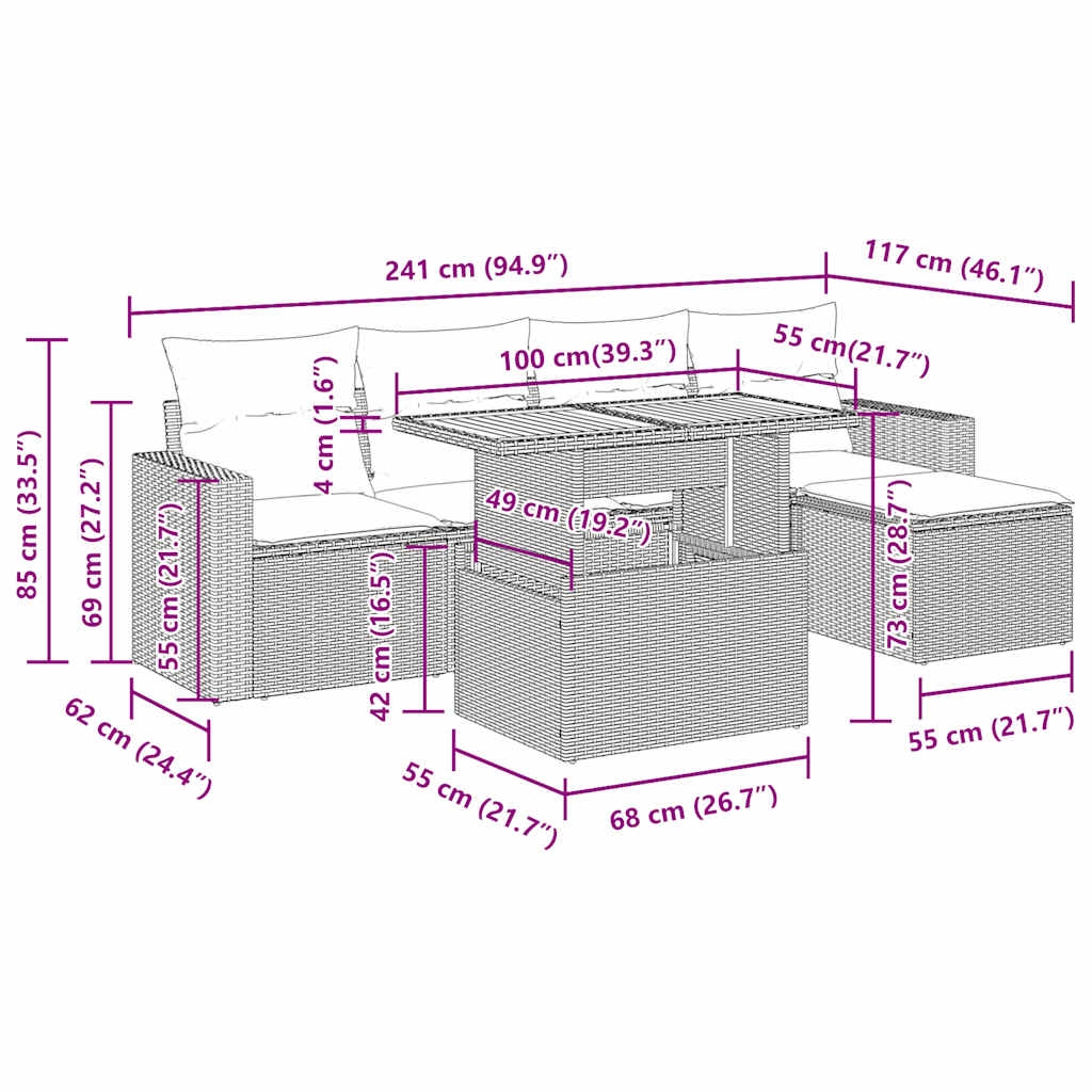 Diese Garten-Sofagarnitur ist die perfekte Ergänzung zu deinem Garten, deiner Terrasse oder deinem Innenhof. Sie bietet einen bequemen und einladenden Platz, um mit Familie und Freunden zu plaudern oder dich einfach nur zu entspannen und das Leben im Freien zu genießen. Langlebiges Material: PE-Rattan, auch als Poly Rattan bekannt, ist ein robustes, pflegeleichtes synthetisches Material, das die Optik von natürlichem Rattan aufweist. Es kennzeichnet sich durch ein geringes Eigengewicht und lässt sich einfach reinigen. Aufgrund seiner Haltbarkeit und Witterungsbeständigkeit wird es häufig bei der Herstellung von Gartenmöbeln verwendet.Stauraum mit wasserfestem Beutel: Jedes Gartensofa verfügt über ein Staufach unter der Sitzfläche, das mit einem wasserfesten Beutel zur Aufbewahrung von Kissen, Spielzeug und anderen Gegenständen versehen ist. Die Kissen sind mit Bezügen versehen und lassen sich mit Klettverschlüssen fest und sicher am Sofa befestigen.Verstellbare Tischplatte: Die Tischplatte lässt sich anheben, um den Gartentisch höher zu machen und ihn von einem Couchtisch in einen Esstisch zu verwandeln. Er eignet sich daher perfekt für Gäste oder Mahlzeiten im Freien.Vielseitiger Fußhocker: Der Hocker ist vielseitig einsetzbar und dient als bequeme Fußstütze beim Entspannen auf dem Sofa oder als zusätzlicher Sitzplatz in deinem Garten.Abnehmbarer und waschbarer Bezug: Diese Sitzkissen verfügen über abnehmbare Bezüge für einfaches Waschen und Pflegen.Robustes und stabiles Gestell: Der pulverbeschichtete Stahlgestell ist stark, stabil, langlebig sowie korrosions- und wetterbeständig, um eine lang anhaltende Leistung zu gewährleisten. Gut zu wissen:Wir empfehlen dir, deine Gartenmöbel mit einer wasserdichten Hülle zu schützen, um lange Zeit eine ansprechende Optik aufzuweisen.