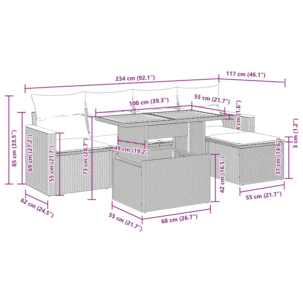 Diese Garten-Sofagarnitur ist die perfekte Ergänzung zu deinem Garten, deiner Terrasse oder deinem Innenhof. Sie bietet einen bequemen und einladenden Platz, um mit Familie und Freunden zu plaudern oder dich einfach nur zu entspannen und das Leben im Freien zu genießen. Langlebiges Material: PE-Rattan, auch als Poly Rattan bekannt, ist ein robustes, pflegeleichtes synthetisches Material, das die Optik von natürlichem Rattan aufweist. Es kennzeichnet sich durch ein geringes Eigengewicht und lässt sich einfach reinigen. Aufgrund seiner Haltbarkeit und Witterungsbeständigkeit wird es häufig bei der Herstellung von Gartenmöbeln verwendet.Stauraum mit wasserfestem Beutel: Jedes Gartensofa verfügt über ein Staufach unter der Sitzfläche, das mit einem wasserfesten Beutel zur Aufbewahrung von Kissen, Spielzeug und anderen Gegenständen versehen ist. Die Kissen sind mit Bezügen versehen und lassen sich mit Klettverschlüssen fest und sicher am Sofa befestigen.Verstellbare Tischplatte: Die Tischplatte lässt sich anheben, um den Gartentisch höher zu machen und ihn von einem Couchtisch in einen Esstisch zu verwandeln. Er eignet sich daher perfekt für Gäste oder Mahlzeiten im Freien.Vielseitiger Fußhocker: Der Hocker ist vielseitig einsetzbar und dient als bequeme Fußstütze beim Entspannen auf dem Sofa oder als zusätzlicher Sitzplatz in deinem Garten.Abnehmbarer und waschbarer Bezug: Diese Sitzkissen verfügen über abnehmbare Bezüge für einfaches Waschen und Pflegen.Robustes und stabiles Gestell: Der pulverbeschichtete Stahlgestell ist stark, stabil, langlebig sowie korrosions- und wetterbeständig, um eine lang anhaltende Leistung zu gewährleisten. Gut zu wissen:Wir empfehlen dir, deine Gartenmöbel mit einer wasserdichten Hülle zu schützen, um lange Zeit eine ansprechende Optik aufzuweisen.