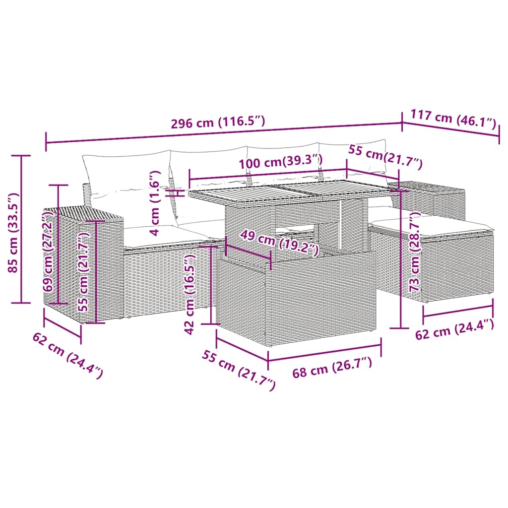 Diese Garten-Sofagarnitur ist die perfekte Ergänzung zu deinem Garten, deiner Terrasse oder deinem Innenhof. Sie bietet einen bequemen und einladenden Platz, um mit Familie und Freunden zu plaudern oder dich einfach nur zu entspannen und das Leben im Freien zu genießen. Langlebiges Material: PE-Rattan, auch als Poly Rattan bekannt, ist ein robustes, pflegeleichtes synthetisches Material, das die Optik von natürlichem Rattan aufweist. Es kennzeichnet sich durch ein geringes Eigengewicht und lässt sich einfach reinigen. Aufgrund seiner Haltbarkeit und Witterungsbeständigkeit wird es häufig bei der Herstellung von Gartenmöbeln verwendet.Stauraum mit wasserfestem Beutel: Jedes Gartensofa verfügt über ein Staufach unter der Sitzfläche, das mit einem wasserfesten Beutel zur Aufbewahrung von Kissen, Spielzeug und anderen Gegenständen versehen ist. Die Kissen sind mit Bezügen versehen und lassen sich mit Klettverschlüssen fest und sicher am Sofa befestigen.Verstellbare Tischplatte: Die Tischplatte lässt sich anheben, um den Gartentisch höher zu machen und ihn von einem Couchtisch in einen Esstisch zu verwandeln. Er eignet sich daher perfekt für Gäste oder Mahlzeiten im Freien.Vielseitiger Fußhocker: Der Hocker ist vielseitig einsetzbar und dient als bequeme Fußstütze beim Entspannen auf dem Sofa oder als zusätzlicher Sitzplatz in deinem Garten.Abnehmbarer und waschbarer Bezug: Diese Sitzkissen verfügen über abnehmbare Bezüge für einfaches Waschen und Pflegen.Robustes und stabiles Gestell: Der pulverbeschichtete Stahlgestell ist stark, stabil, langlebig sowie korrosions- und wetterbeständig, um eine lang anhaltende Leistung zu gewährleisten. Gut zu wissen:Wir empfehlen dir, deine Gartenmöbel mit einer wasserdichten Hülle zu schützen, um lange Zeit eine ansprechende Optik aufzuweisen.