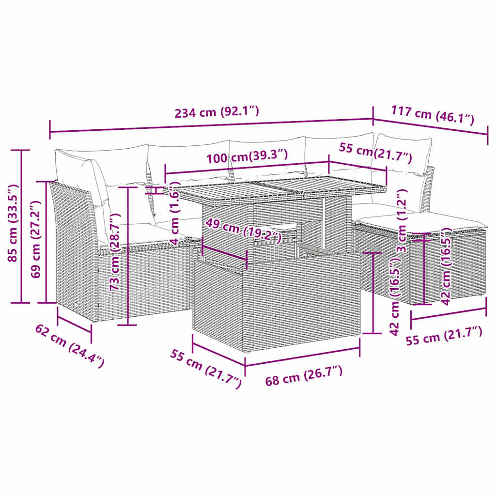 Diese Garten-Sofagarnitur ist die perfekte Ergänzung zu deinem Garten, deiner Terrasse oder deinem Innenhof. Sie bietet einen bequemen und einladenden Platz, um mit Familie und Freunden zu plaudern oder dich einfach nur zu entspannen und das Leben im Freien zu genießen. Langlebiges Material: PE-Rattan, auch als Poly Rattan bekannt, ist ein robustes, pflegeleichtes synthetisches Material, das die Optik von natürlichem Rattan aufweist. Es kennzeichnet sich durch ein geringes Eigengewicht und lässt sich einfach reinigen. Aufgrund seiner Haltbarkeit und Witterungsbeständigkeit wird es häufig bei der Herstellung von Gartenmöbeln verwendet.Stauraum mit wasserfestem Beutel: Jedes Gartensofa verfügt über ein Staufach unter der Sitzfläche, das mit einem wasserfesten Beutel zur Aufbewahrung von Kissen, Spielzeug und anderen Gegenständen versehen ist. Die Kissen sind mit Bezügen versehen und lassen sich mit Klettverschlüssen fest und sicher am Sofa befestigen.Verstellbare Tischplatte: Die Tischplatte lässt sich anheben, um den Gartentisch höher zu machen und ihn von einem Couchtisch in einen Esstisch zu verwandeln. Er eignet sich daher perfekt für Gäste oder Mahlzeiten im Freien.Vielseitiger Fußhocker: Der Hocker ist vielseitig einsetzbar und dient als bequeme Fußstütze beim Entspannen auf dem Sofa oder als zusätzlicher Sitzplatz in deinem Garten.Abnehmbarer und waschbarer Bezug: Diese Sitzkissen verfügen über abnehmbare Bezüge für einfaches Waschen und Pflegen.Robustes und stabiles Gestell: Der pulverbeschichtete Stahlgestell ist stark, stabil, langlebig sowie korrosions- und wetterbeständig, um eine lang anhaltende Leistung zu gewährleisten. Gut zu wissen:Wir empfehlen dir, deine Gartenmöbel mit einer wasserdichten Hülle zu schützen, um lange Zeit eine ansprechende Optik aufzuweisen.