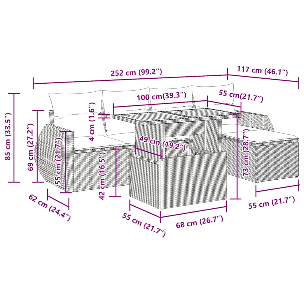 Diese Garten-Sofagarnitur ist die perfekte Ergänzung zu deinem Garten, deiner Terrasse oder deinem Innenhof. Sie bietet einen bequemen und einladenden Platz, um mit Familie und Freunden zu plaudern oder dich einfach nur zu entspannen und das Leben im Freien zu genießen. Langlebiges Material: PE-Rattan, auch als Poly Rattan bekannt, ist ein robustes, pflegeleichtes synthetisches Material, das die Optik von natürlichem Rattan aufweist. Es kennzeichnet sich durch ein geringes Eigengewicht und lässt sich einfach reinigen. Aufgrund seiner Haltbarkeit und Witterungsbeständigkeit wird es häufig bei der Herstellung von Gartenmöbeln verwendet.Stauraum mit wasserfestem Beutel: Jedes Gartensofa verfügt über ein Staufach unter der Sitzfläche, das mit einem wasserfesten Beutel zur Aufbewahrung von Kissen, Spielzeug und anderen Gegenständen versehen ist. Die Kissen sind mit Bezügen versehen und lassen sich mit Klettverschlüssen fest und sicher am Sofa befestigen.Verstellbare Tischplatte: Die Tischplatte lässt sich anheben, um den Gartentisch höher zu machen und ihn von einem Couchtisch in einen Esstisch zu verwandeln. Er eignet sich daher perfekt für Gäste oder Mahlzeiten im Freien.Vielseitiger Fußhocker: Der Hocker ist vielseitig einsetzbar und dient als bequeme Fußstütze beim Entspannen auf dem Sofa oder als zusätzlicher Sitzplatz in deinem Garten.Abnehmbarer und waschbarer Bezug: Diese Sitzkissen verfügen über abnehmbare Bezüge für einfaches Waschen und Pflegen.Robustes und stabiles Gestell: Der pulverbeschichtete Stahlgestell ist stark, stabil, langlebig sowie korrosions- und wetterbeständig, um eine lang anhaltende Leistung zu gewährleisten. Gut zu wissen:Wir empfehlen dir, deine Gartenmöbel mit einer wasserdichten Hülle zu schützen, um lange Zeit eine ansprechende Optik aufzuweisen.