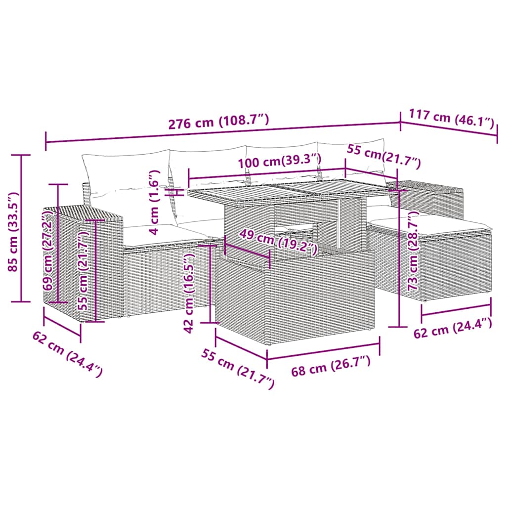Diese Garten-Sofagarnitur ist die perfekte Ergänzung zu deinem Garten, deiner Terrasse oder deinem Innenhof. Sie bietet einen bequemen und einladenden Platz, um mit Familie und Freunden zu plaudern oder dich einfach nur zu entspannen und das Leben im Freien zu genießen. Langlebiges Material: PE-Rattan, auch als Poly Rattan bekannt, ist ein robustes, pflegeleichtes synthetisches Material, das die Optik von natürlichem Rattan aufweist. Es kennzeichnet sich durch ein geringes Eigengewicht und lässt sich einfach reinigen. Aufgrund seiner Haltbarkeit und Witterungsbeständigkeit wird es häufig bei der Herstellung von Gartenmöbeln verwendet.Stauraum mit wasserfestem Beutel: Jedes Gartensofa verfügt über ein Staufach unter der Sitzfläche, das mit einem wasserfesten Beutel zur Aufbewahrung von Kissen, Spielzeug und anderen Gegenständen versehen ist. Die Kissen sind mit Bezügen versehen und lassen sich mit Klettverschlüssen fest und sicher am Sofa befestigen.Verstellbare Tischplatte: Die Tischplatte lässt sich anheben, um den Gartentisch höher zu machen und ihn von einem Couchtisch in einen Esstisch zu verwandeln. Er eignet sich daher perfekt für Gäste oder Mahlzeiten im Freien.Vielseitiger Fußhocker: Der Hocker ist vielseitig einsetzbar und dient als bequeme Fußstütze beim Entspannen auf dem Sofa oder als zusätzlicher Sitzplatz in deinem Garten.Abnehmbarer und waschbarer Bezug: Diese Sitzkissen verfügen über abnehmbare Bezüge für einfaches Waschen und Pflegen.Robustes und stabiles Gestell: Der pulverbeschichtete Stahlgestell ist stark, stabil, langlebig sowie korrosions- und wetterbeständig, um eine lang anhaltende Leistung zu gewährleisten. Gut zu wissen:Wir empfehlen dir, deine Gartenmöbel mit einer wasserdichten Hülle zu schützen, um lange Zeit eine ansprechende Optik aufzuweisen.