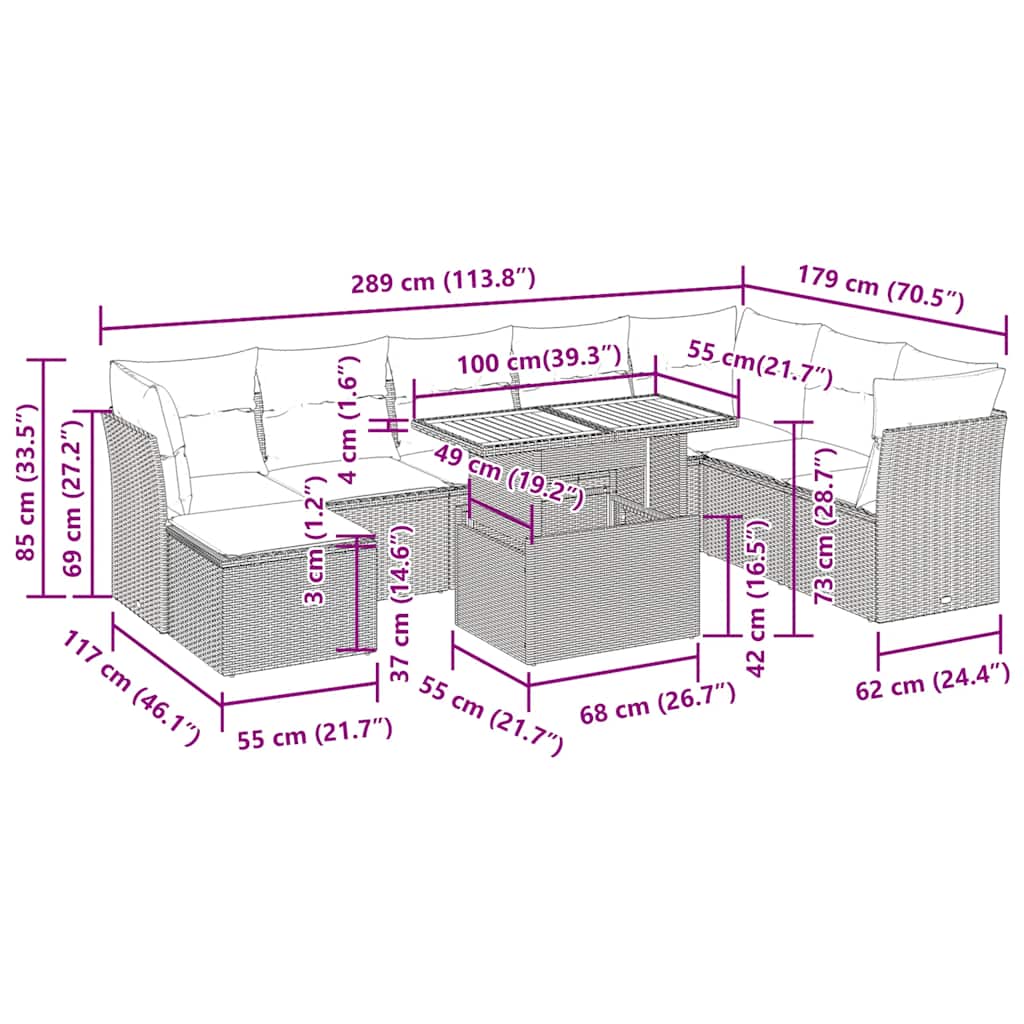 Diese Garten-Sofagarnitur ist die perfekte Ergänzung zu deinem Garten, deiner Terrasse oder deinem Innenhof. Sie bietet einen bequemen und einladenden Platz, um mit Familie und Freunden zu plaudern oder dich einfach nur zu entspannen und das Leben im Freien zu genießen. Langlebiges Material: PE-Rattan, auch als Poly Rattan bekannt, ist ein robustes, pflegeleichtes synthetisches Material, das die Optik von natürlichem Rattan aufweist. Es kennzeichnet sich durch ein geringes Eigengewicht und lässt sich einfach reinigen. Aufgrund seiner Haltbarkeit und Witterungsbeständigkeit wird es häufig bei der Herstellung von Gartenmöbeln verwendet.Stauraum mit wasserfestem Beutel: Jedes Gartensofa verfügt über ein Staufach unter der Sitzfläche, das mit einem wasserfesten Beutel zur Aufbewahrung von Kissen, Spielzeug und anderen Gegenständen versehen ist. Die Kissen sind mit Bezügen versehen und lassen sich mit Klettverschlüssen fest und sicher am Sofa befestigen.Verstellbare Tischplatte: Die Tischplatte lässt sich anheben, um den Gartentisch höher zu machen und ihn von einem Couchtisch in einen Esstisch zu verwandeln. Er eignet sich daher perfekt für Gäste oder Mahlzeiten im Freien.Vielseitiger Fußhocker: Der Hocker ist vielseitig einsetzbar und dient als bequeme Fußstütze beim Entspannen auf dem Sofa oder als zusätzlicher Sitzplatz in deinem Garten.Abnehmbarer und waschbarer Bezug: Diese Sitzkissen verfügen über abnehmbare Bezüge für einfaches Waschen und Pflegen.Robustes und stabiles Gestell: Der pulverbeschichtete Stahlgestell ist stark, stabil, langlebig sowie korrosions- und wetterbeständig, um eine lang anhaltende Leistung zu gewährleisten. Gut zu wissen:Wir empfehlen dir, deine Gartenmöbel mit einer wasserdichten Hülle zu schützen, um lange Zeit eine ansprechende Optik aufzuweisen.