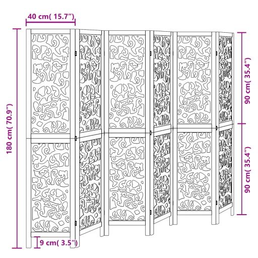 Verleihe deinem Wohnraum eine auffällige dekorative Note mit diesem bezaubernden Raumteiler. Langlebig und leicht zu reinigen: Der Sichtschutz ist aus Paulownia-Massivholz und Holzwerkstoff gefertigt, wodurch er pflegeleicht und strapazierfähig ist.Robuster Rahmen: Der Rahmen aus massivem Paulownia-Holz sorgt für Robustheit und Stabilität. Paulownia-Massivholz ist ein wunderschönes Naturmaterial. Paulowniaholz ist widerstandsfähig gegen Schädlingsbefall und Verrottung.Flexibel und einfach faltbar: Die Paravent-Teile sind jeweils durch 3 Metallscharniere miteinander verbunden. Die oberen und unteren Paneele dieser spanischen Wand sind durch verborgene 2-in-1-Scharniere verbunden. Der Raumtrenner kann also leicht bis zu einem gewissen Grad zusammengeklappt werden; dadurch spart er bei Nichtgebrauch Platz.Vielseitig einsetzbar: Die Trennwand eignet sich hervorragend zur Schaffung von Privatsphäre im Schlafzimmer, Wohnzimmer, Büro und anderen Räumen. Du kannst das Paravent auch vor ein Fenster stellen, um intensives Sonnenlicht abzuschirmen.Attraktiver Look: Mit seinem filigranen Muster verleiht diese faltbare Trennwand jedem Raum mehr Charakter. Achtung:Nur für den Innenbereich!