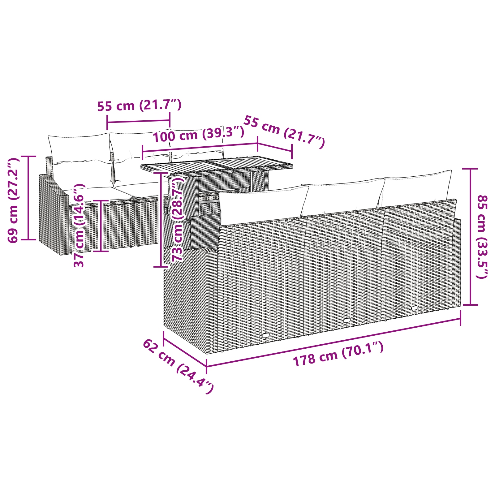 - Lieferumfang: 4 x Armsofa mit Stauraum, 2 x zentrale Sitzfläche mit Stauraum, 1 x Gartentisch
