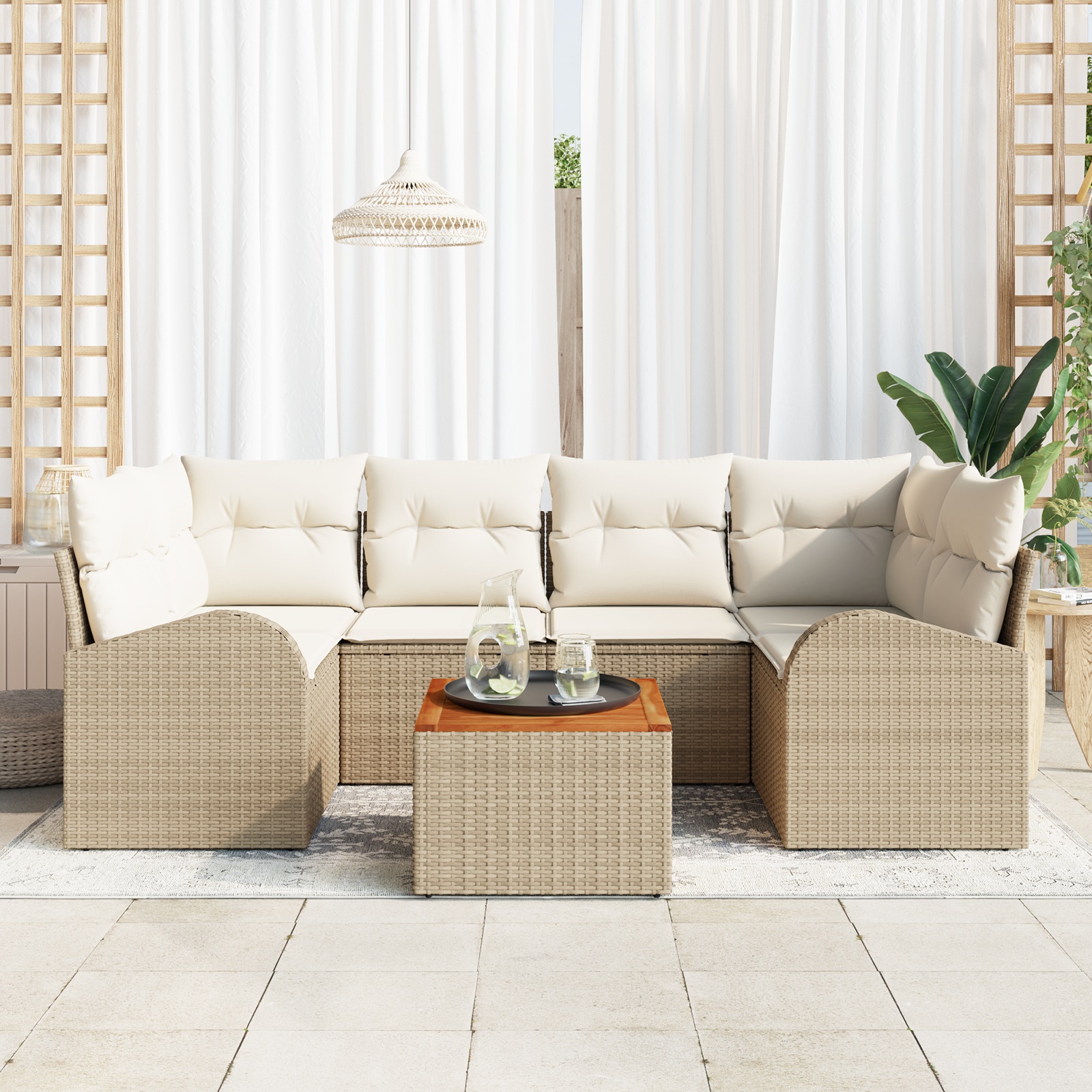 Mit diesem Garten-Sofa-Set wird dein Außenbereich zum perfekten Ort zum Entspannen oder für Familientreffen. Das moderne Design bietet viel Platz und vereint Komfort mit Praktikabilität, ideal für Balkone, Terrassen oder Gärten. Komfort und Kapazität: Platz für bis zu sieben Erwachsene, perfekt für gesellige Treffen. Das geräumige Layout fördert die Interaktion und macht alles noch einladender. Haltbare Materialien: UV-geschütztes, wasserfestes Rattan sorgt für Langlebigkeit und behält gleichzeitig seine Optik. Einfach zu pflegen: Abnehmbare Kissenbezüge mit Reißverschluss machen Reinigung kinderleicht. Einfach abziehen, waschen und wieder anbringen, damit alles frisch aussieht. Vielseitige Nutzung: Ideal für das Essen im Freien oder zum Entspannen, das Set ist für verschiedene Anlässe geeignet. Stilvoller Minimalismus: Die moderne Farbgebung passt zu vielen Terrassen und sorgt für eine elegante Atmosphäre.