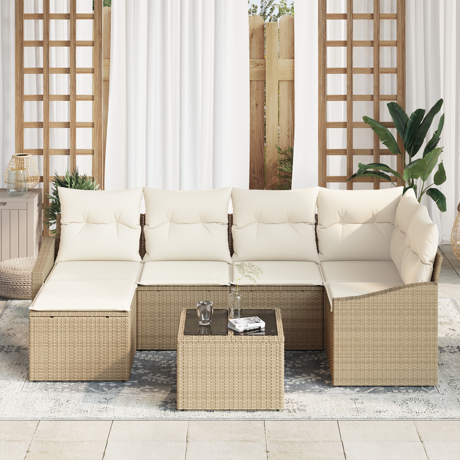 Dieses modulare Sektionalsessel Set für draußen ist eine wunderbare Ergänzung für jede Terrasse oder jeden Garten. Es verbindet Praktikabilität und modernen Stil. Hergestellt aus robustem Poly-Rattan, passt es super in verschiedene Außenbereiche und bietet einen gemütlichen Platz zum Entspannen mit Familie und Freunden. Vielseitiges modulares Design: Das Garten Sofa Set hat ein flexibles Design, das dir erlaubt, die Anordnung zu ändern, perfekt für alle Arten von Treffen. Stell es genau so auf, wie du es brauchst, egal ob für einen kleinen Balkon oder einen großen Garten. Wetterfestes Material: Diese Poly-Rattan-Bauweise ist super robust und hält jedem Wetter stand, sodass deine Möbel Saison für Saison gut aussehen. Ideal für unberechenbare Wetterbedingungen. Bequeme Kissen: Jedes Teil hat bequeme Kissen, die stundenlanges Entspannen ermöglichen, egal ob bei einer Sommerparty oder einem gemütlichen Nachmittag. Die abnehmbaren Bezüge sind leicht zu reinigen. Stylisches modernes Aussehen: Mit dem trendigen braunen Finish und den cremigen Kissen hat dieses Sofa ein modernes Flair und macht deinen Außenbereich zu einem schicken Rückzugsort. Perfekt für zeitgenössische Patios. Platz für alle: Bietet Platz für bis zu sechs Personen, ideal für das Ausrichten von Treffen, damit alle draußen eine gute Zeit haben.