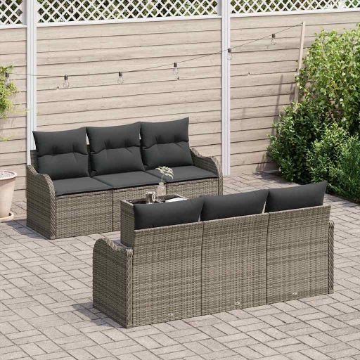 Dieses 7-teilige Garten Sofa Set ist genau das Richtige für entspannte Stunden im Freien oder gesellige Treffen. Perfekt für Balkone oder Gärten, verleiht die schicke graue Poly Rattan Bauweise deinem Außenbereich einen tollen Look. Modulare Flexibilität: Das modulare Design ermöglicht dir, das Sofa Set nach deinen Wünschen anzupassen, egal ob für Gäste oder einen ruhigen Abend. Forme es, wie du willst, für maximalen Komfort. Wetterfester Stoff: Die Kissen sind aus wetterfestem Material, das sie vor Wettereinflüssen schützt und dafür sorgt, dass sie saisonübergreifend draußen bleiben. Einzigartige handgewebte Textur: Jedes Stück hat ein handgewebtes Design, das ihm einen besonderen Look und Stil verleiht. Einfaches Reinigen: Die abnehmbaren Kissen machen die Pflege des Sofa Sets einfach. Nimm sie einfach ab, wasche sie und ziehe sie dann zurück für einen frischen Look. Bequeme Sitzgelegenheiten: Für mehrere Gäste gedacht, bietet dieses Set Platz für bis zu 5 Personen, ideal für Zusammenkünfte oder Familientreffen.