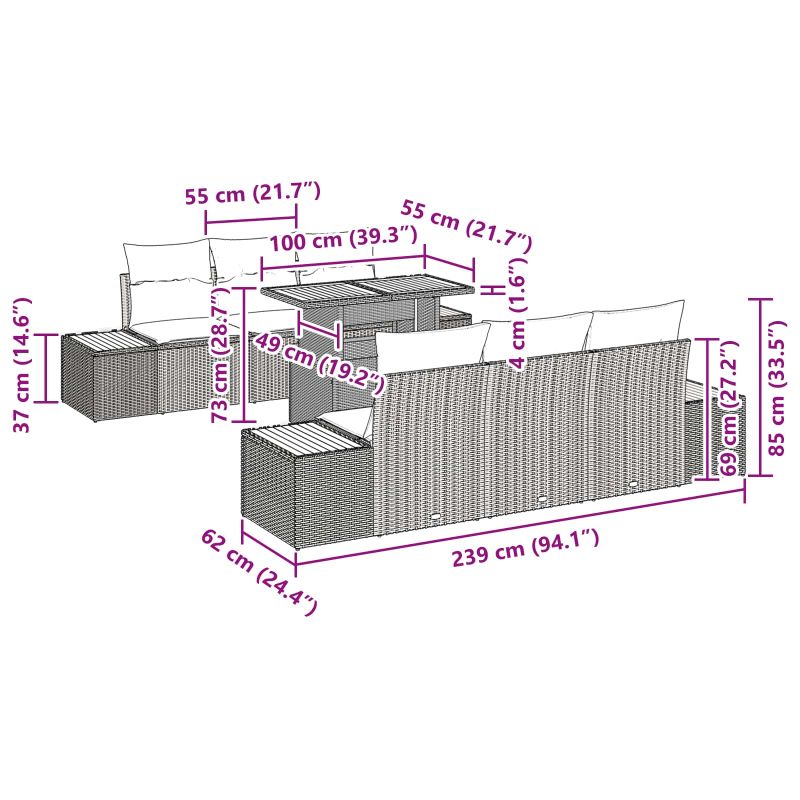 Dieses 7-teilige Garten Sofa Set steht für modernen Luxus und Komfort – ideal zum Abhängen oder einfach zum Relaxen. Das schlanke Design, mit einer Mischung aus Schwarz- und Brauntönen, verleiht jedem Balkon oder Garten einen charmanten Touch. Modulare Gestaltung: Das schlaue Design erlaubt es dir, das Sofa Set in verschiedene Formen zu arrangieren, um deinen Außenbereich und den Style anzupassen. Super vielseitig für jeden Anlass. Komfort an erster Stelle: Jeder Sitz kommt mit gemütlichen Kissen, die für extra Komfort sorgen – so kannst du Stunden lang entspannen, ob mit Gästen oder einfach allein. Robuste Bauweise: Hergestellt aus UV-resistentem und wasserfestem Poly Rattan, ist dieses Outdoor-Möbel wetterfest und sorgt dafür, dass es langlebig und gut aussieht. Stylishe Holz-Akzente: Der Tisch hat eine schöne Naturholz-Oberfläche, die Charme und einen modernen Twist hinzufügt, im tollen Kontrast zum synthetischen Rattan. Einfache Pflege: Mit abnehmbaren Kissenbezügen und leicht zu reinigenden Oberflächen, ist es ganz einfach, das Sofa Set in Topform zu halten, sodass du mehr Zeit hast, deinen Außenbereich zu genießen.