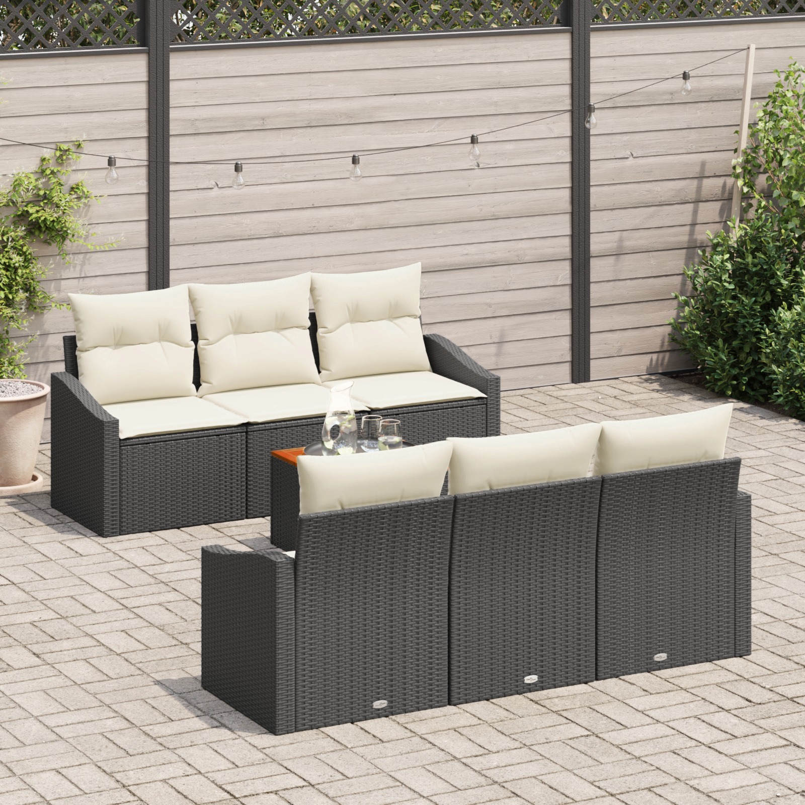 Das 7-teilige Garten-Sofa-Set verbindet stilvollen Look mit komfortablem Sitzen und ist die Top-Wahl für Patios, Balkone oder Gärten. Mit einer schlichten matten Oberfläche und aus hochwertigem Poly-Rattan in schickem Schwarz-Weiß gefertigt, ist es perfekt zum Relaxen – ideal für Feiern mit der Familie oder romantische Abendessen unter dem Sternenhimmel. Bequeme Sitzgelegenheit: Für bis zu sechs Personen mit bequemen Kastenpolstern. Ideal zum Relaxen oder für Zusammenkünfte. Robustheit: Hergestellt aus wasserabweisenden Materialien, trotzt dieses Set jedem Wetter und hat eine lange Lebensdauer. Außerdem ist es UV-beständig, sodass die Farben auch in der Sonne strahlen. Einfache Montage: Dank der klaren Anleitung ist der Aufbau kinderleicht. Du brauchst nur zwei Personen und ein paar Werkzeuge. So bist du im Handumdrehen bereit, deinen neuen Sitzplatz zu genießen. Vielseitiges Design: Das moderne Design fügt sich in verschiedene Deko-Stile ein und eignet sich für Terrassen, Gärten oder Innenräume. Die schöne matte Oberfläche harmoniert perfekt mit der Natur. Leicht zu reinigen: Die Kissen haben abnehmbare Bezüge mit Reißverschlüssen, was die Pflege zum Kinderspiel macht. So bleibt dein Sofa-Set ganz einfach in Topform.