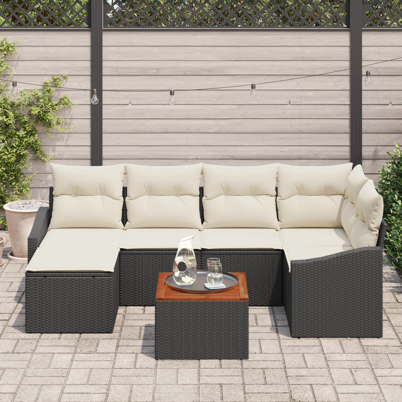 Gib deinem Außenbereich ein neues Flair mit dem 7-teiligem Garten Sofa Set, das für Entspannung und Stil gestaltet wurde. Schickes Schwarz-Weißen Design, wetterfeste Kissen, praktischer Stauraum und ein stylisches ergonomisches Design machen dieses Set perfekt für jeden Außenbereich.