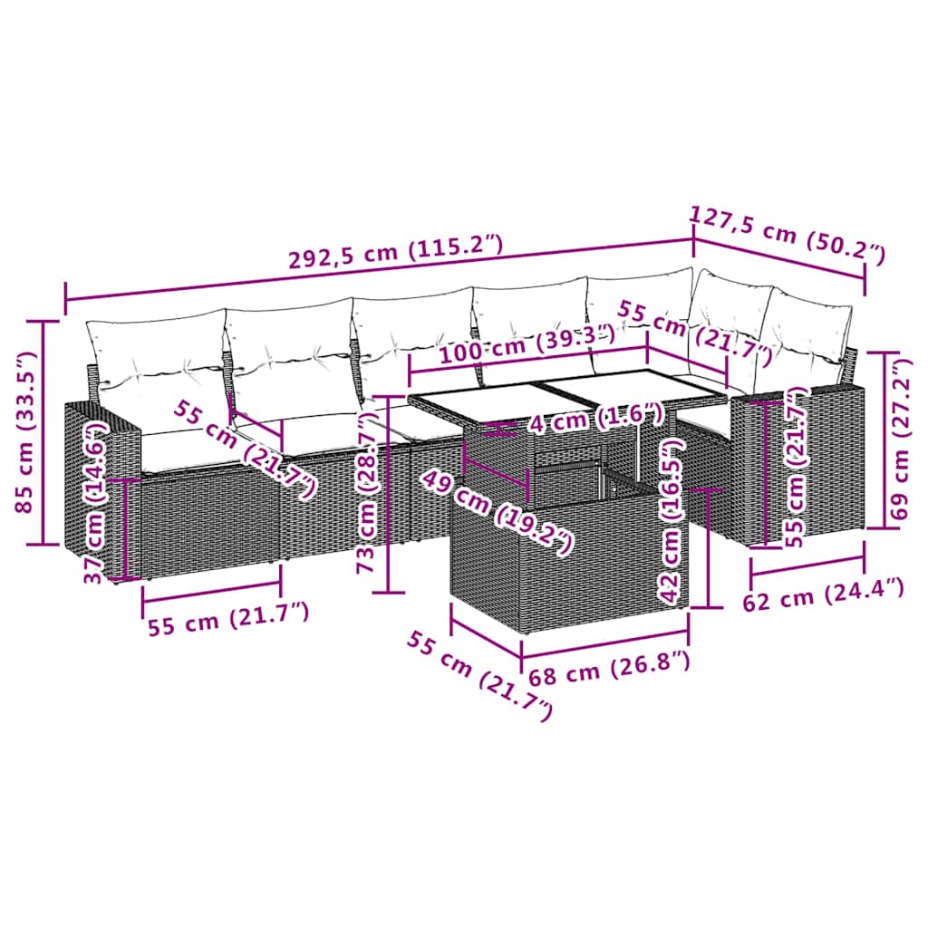 7-teiliges Gartensofa-Set mit Kissen, grau, Polyrattan