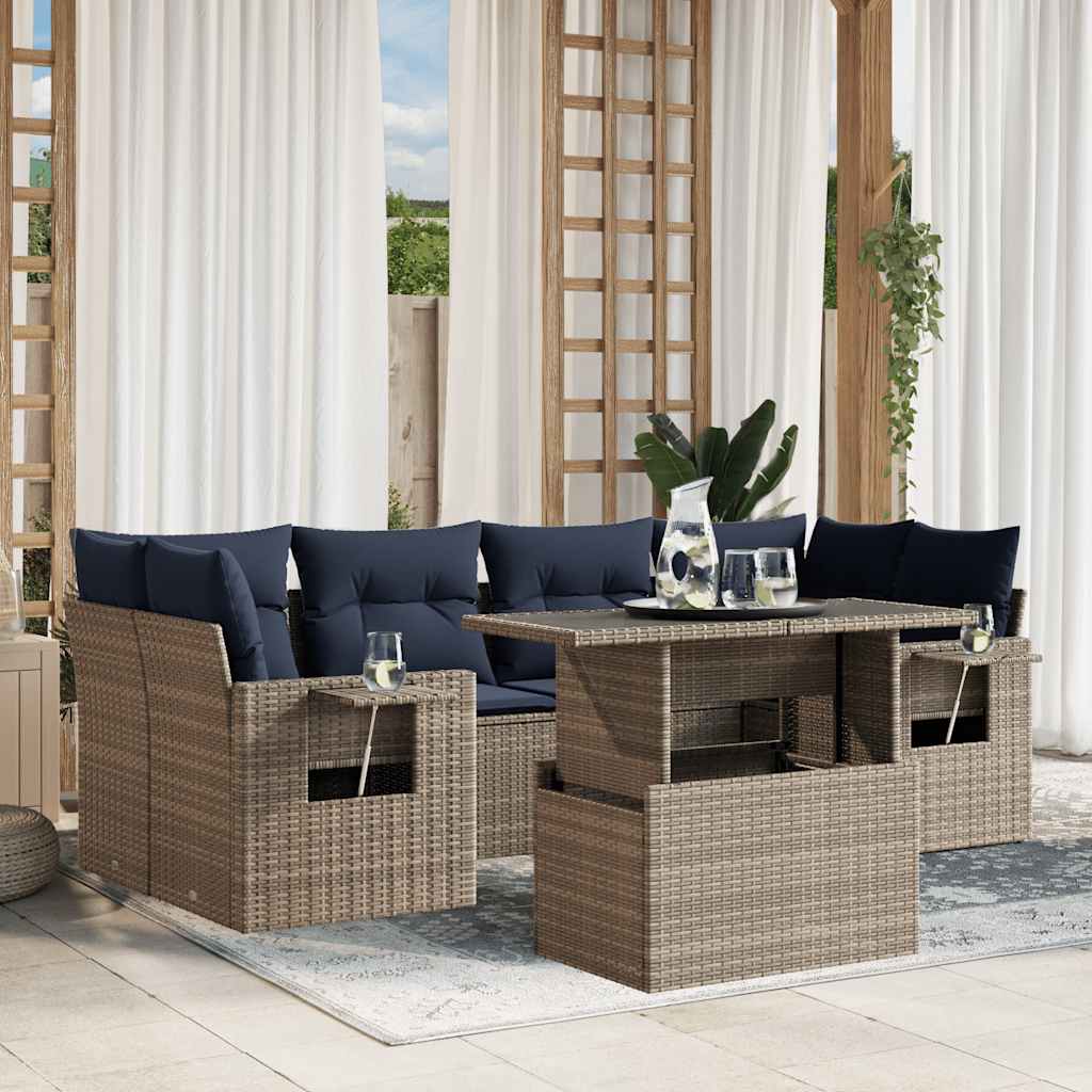 Dieses Gartensofa-Set ist die perfekte Ergänzung für Ihren Garten, Ihre Terrasse oder Ihren Innenhof und bietet einen komfortablen und einladenden Platz zum Plaudern mit Familie und Freunden oder einfach zum Entspannen und Genießen der Natur. Langlebiges Material: PE-Rattan, auch bekannt als Polyrattan, ist ein robustes, pflegeleichtes Kunststoffmaterial, das wie natürliches Rattan aussieht. Es ist leicht, einfach zu reinigen und wird aufgrund seiner Langlebigkeit und Wetterbeständigkeit häufig für Gartenmöbel verwendet.Verstellbare Tischplatte: Die Tischplatte kann angehoben werden, um den Tisch höher zu stellen, wodurch der Gartentisch von einem Couchtisch in einen Esstisch verwandelt wird. Er ist perfekt, um Gäste zu empfangen oder Mahlzeiten im Freien einzunehmen.Praktischer Beistelltisch: Dieses Gartenmöbel verfügt über klappbare Beistelltische mit Gasdruckfeder an den Armlehnen, die praktische Ablageflächen für wichtige Dinge bieten. Bequemes Sitzerlebnis: Diese Gartenmöbel mit dick gepolsterten Kissen bieten ein bequemes Sitzerlebnis.Modulares Design: Dieses Gartenmöbel-Set ist modular aufgebaut und daher völlig flexibel und leicht zu bewegen, sodass Sie Ihre Gartenmöbel individuell zusammenstellen können. Gut zu wissen:Damit Ihre Gartenmöbel lange schön bleiben, empfehlen wir Ihnen, sie mit einer wasserdichten Abdeckung zu schützen.