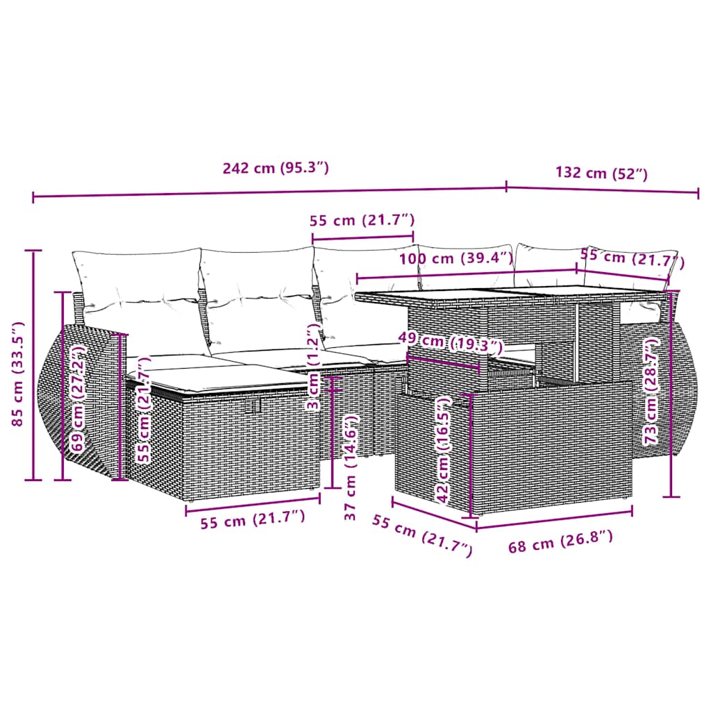 Dieses Gartensofa-Set ist die perfekte Ergänzung für Ihren Garten, Ihre Terrasse oder Ihren Innenhof und bietet einen komfortablen und einladenden Platz zum Plaudern mit Familie und Freunden oder einfach zum Entspannen und Genießen der Natur. Langlebiges Material: PE-Rattan, auch bekannt als Polyrattan, ist ein robustes, pflegeleichtes Kunststoffmaterial, das wie natürliches Rattan aussieht. Es ist leicht, einfach zu reinigen und wird aufgrund seiner Langlebigkeit und Wetterbeständigkeit häufig für Gartenmöbel verwendet.Verstellbare Tischplatte: Die Tischplatte kann angehoben werden, um den Tisch höher zu machen, wodurch der Gartentisch von einem Couchtisch in einen Esstisch verwandelt wird. Er eignet sich perfekt, um Gäste einzuladen oder draußen zu essen.Glastischplatte: Die Tischplatte des Gartentisches besteht aus starkem und langlebigem Hartglas, sodass sie sich leicht mit einem feuchten Tuch reinigen lässt und Ihrem Außenbereich einen Hauch von Eleganz verleiht.Abnehmbarer und waschbarer Bezug: Diese Sitzkissen verfügen über abnehmbare Bezüge, die sich leicht waschen und pflegen lassen.Modulares Design: Dieses Gartenmöbelset hat ein modulares Design, wodurch es völlig flexibel und leicht zu bewegen ist, sodass Sie eine individuelle Gartenmöbelanordnung erstellen können. Gut zu wissen:Damit Ihre Gartenmöbel schön bleiben, empfehlen wir Ihnen, sie mit einer wasserdichten Abdeckung zu schützen.