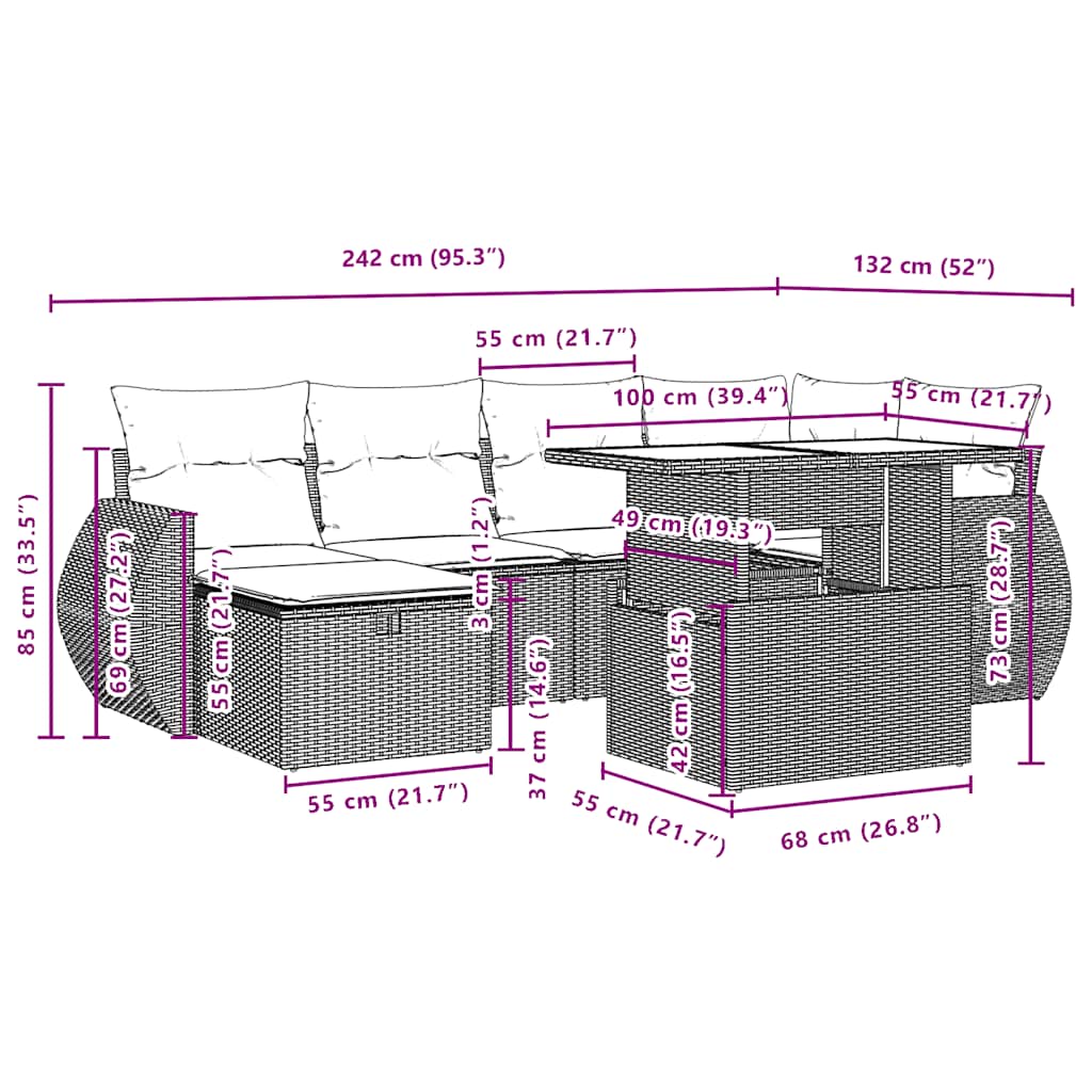 Dieses Gartensofa-Set ist die perfekte Ergänzung für Ihren Garten, Ihre Terrasse oder Ihren Innenhof und bietet einen komfortablen und einladenden Platz zum Plaudern mit Familie und Freunden oder einfach zum Entspannen und Genießen der Natur. Langlebiges Material: PE-Rattan, auch bekannt als Polyrattan, ist ein robustes, pflegeleichtes Kunststoffmaterial, das wie natürliches Rattan aussieht. Es ist leicht, einfach zu reinigen und wird aufgrund seiner Langlebigkeit und Wetterbeständigkeit häufig für Gartenmöbel verwendet.Verstellbare Tischplatte: Die Tischplatte kann angehoben werden, um den Tisch höher zu machen, wodurch der Gartentisch von einem Couchtisch in einen Esstisch verwandelt wird. Er eignet sich perfekt, um Gäste einzuladen oder draußen zu essen.Glastischplatte: Die Tischplatte des Gartentisches besteht aus starkem und langlebigem Hartglas, sodass sie sich leicht mit einem feuchten Tuch reinigen lässt und Ihrem Außenbereich einen Hauch von Eleganz verleiht.Abnehmbarer und waschbarer Bezug: Diese Sitzkissen verfügen über abnehmbare Bezüge, die sich leicht waschen und pflegen lassen.Modulares Design: Dieses Gartenmöbelset hat ein modulares Design, wodurch es völlig flexibel und leicht zu bewegen ist, sodass Sie eine individuelle Gartenmöbelanordnung erstellen können. Gut zu wissen:Damit Ihre Gartenmöbel schön bleiben, empfehlen wir Ihnen, sie mit einer wasserdichten Abdeckung zu schützen.