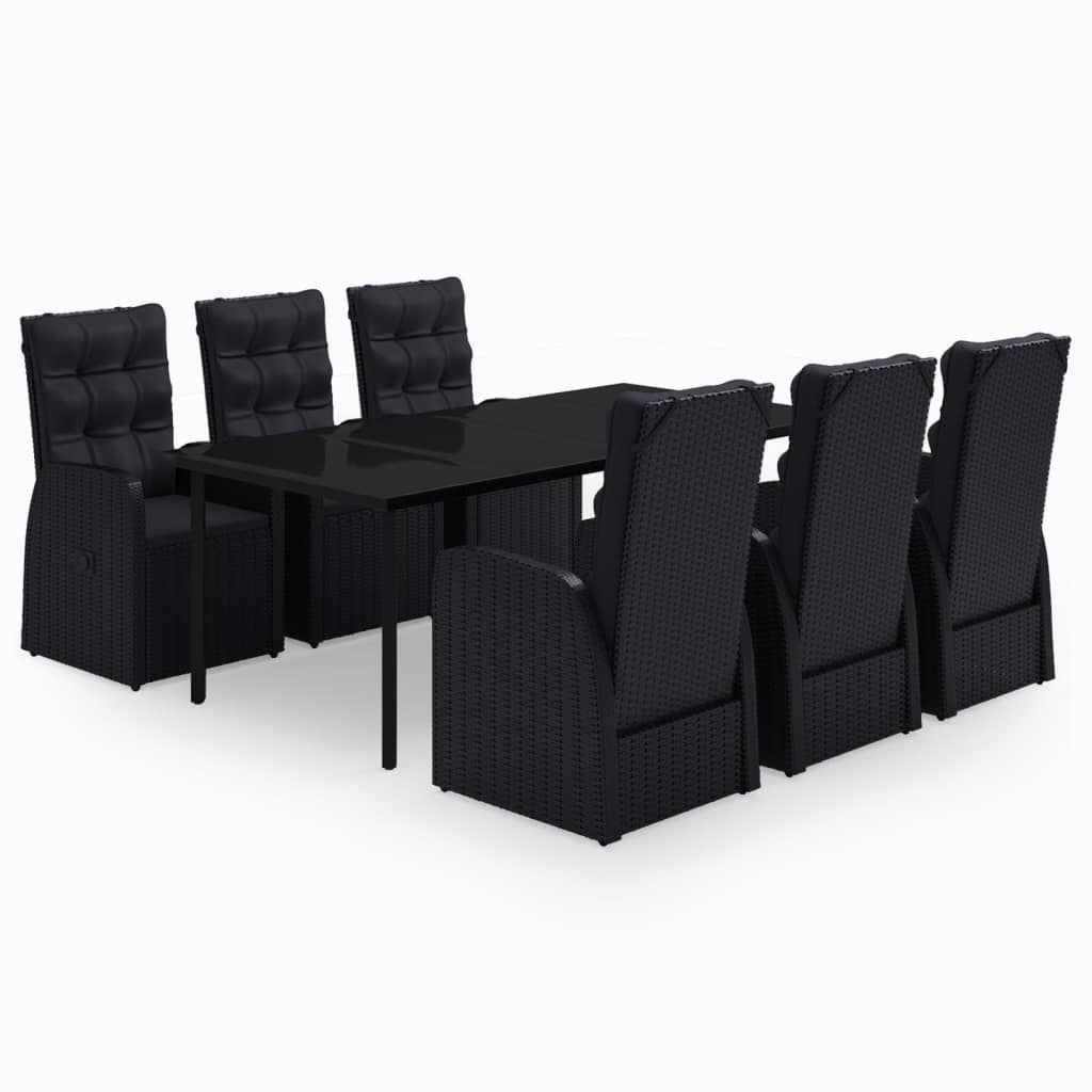 Diese stilvolle Garten-Essgruppe wird der Mittelpunkt Ihres Gartens oder Ihrer Terrasse sein! Sie ist eine ausgezeichnete Wahl für Mahlzeiten im Freien oder zum Entspannen in Ihrem Außenbereich! Die pulverbeschichteten Stahlrahmen machen den Tisch und die Stühle robust und stabil; dadurch ist das Gartenmöbel-Set perfekt für den täglichen Gebrauch im Freien. Dank des wasserabweisenden PE-Rattans sind die Gartenstühle leicht zu reinigen und sehr strapazierfähig. Die Rückenlehne lässt sich durch Ziehen des Knopfes an der Seite verstellen. Dank der leichten Konstruktion sind diese Outdoor-Möbel leicht zu transportieren. Auch die dick gepolsterten Sitzkissen sorgen für zusätzlichen Komfort. Die pflegeleichten Polyesterbezüge können abgenommen und gewaschen werden. Außerdem lässt sich die glatte Glastischplatte leicht mit einem feuchten Tuch reinigen und eignet sich perfekt zum Abstellen von Speisen, Getränken und anderen dekorativen Gegenständen. Hinweis: Um die Lebensdauer deiner Gartenmöbel zu verlängern, empfehlen wir dir, sie mit einer wasserdichten Abdeckung zu schützen.