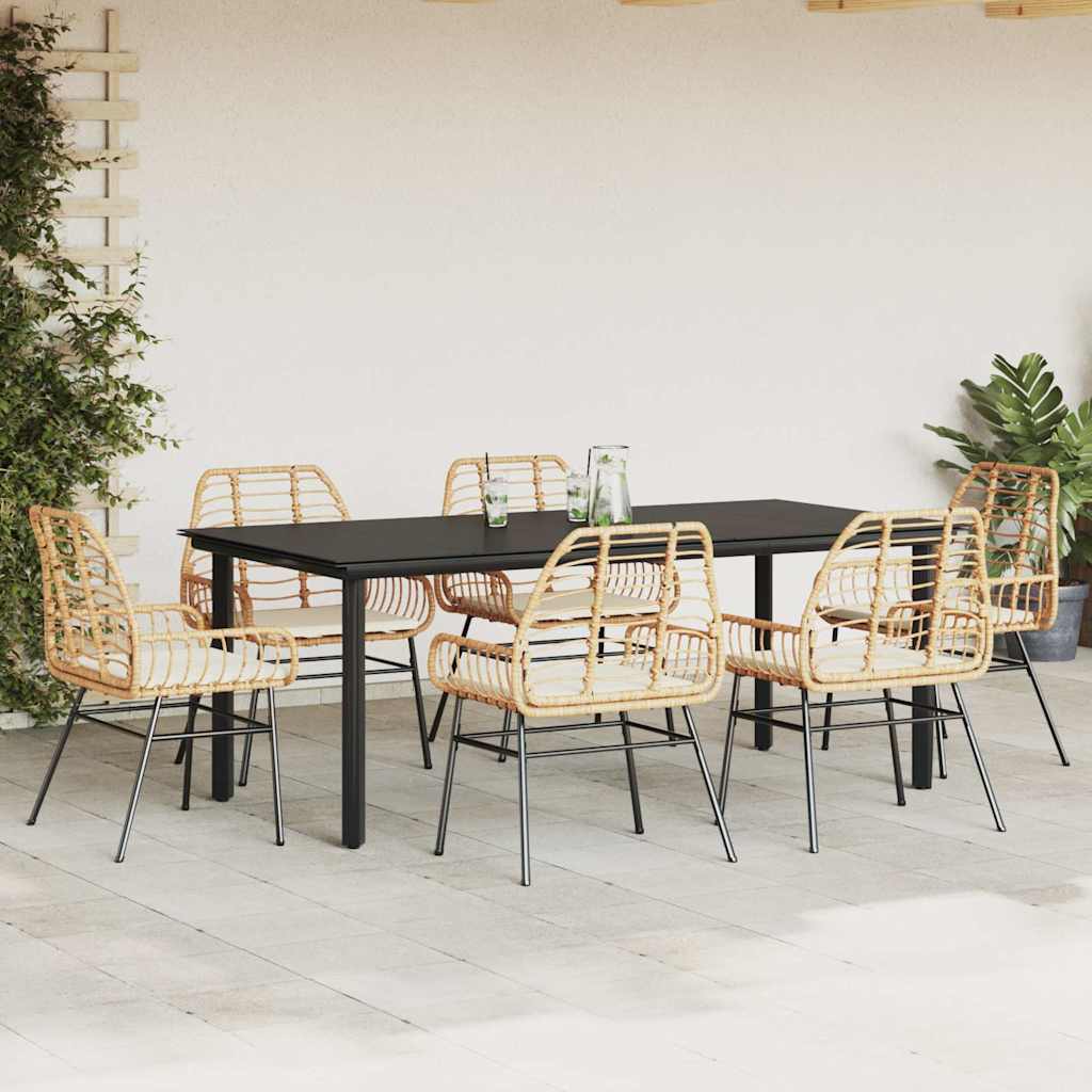 Diese Garten-Essgruppe ist eine ideale Wahl für Mahlzeiten im Freien oder einfach nur zum Entspannen im Garten, Hinterhof oder auf der Terrasse. Langlebiges Material: PE-Rattan, auch als Poly Rattan bekannt, ist ein robustes, pflegeleichtes synthetisches Material, das die Optik von natürlichem Rattan aufweist. Es kennzeichnet sich durch ein geringes Eigengewicht und lässt sich einfach reinigen. Aufgrund seiner Haltbarkeit und Witterungsbeständigkeit wird es häufig bei der Herstellung von Gartenmöbeln verwendet.Robustes und stabiles Gestell: Der pulverbeschichtete Stahlgestell ist stark, stabil, langlebig sowie korrosions- und wetterbeständig, um eine lang anhaltende Leistung zu gewährleisten.Praktische Rückenlehne und Armlehne: Dieser Gartenstuhl verfügt über eine Rückenlehne und zwei Armlehnen, die dem Benutzer optimalen Halt und Komfort bieten.Abnehmbarer und waschbarer Bezug: Diese Sitzkissen verfügen über abnehmbare Bezüge für einfaches Waschen und Pflegen.Tischplatte aus Glas: Die Tischplatte des Gartentisches besteht aus starkem und langlebigem Hartglas, sodass sie leicht mit einem feuchten Tuch gereinigt werden kann und deinem Außenbereich einen Hauch von Eleganz verleiht. Gut zu wissen:Wir empfehlen dir, deine Gartenmöbel mit einer wasserdichten Hülle zu schützen, um lange Zeit eine ansprechende Optik aufzuweisen.