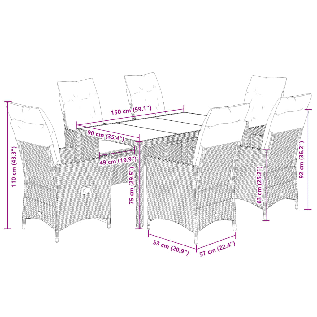 Diese Garten-Essgruppe ist eine ideale Wahl für Mahlzeiten im Freien oder einfach nur zum Entspannen im Garten, Hinterhof oder auf der Terrasse. Langlebiges Material: PE-Rattan, auch als Poly Rattan bekannt, ist ein robustes, pflegeleichtes synthetisches Material, das die Optik von natürlichem Rattan aufweist. Es kennzeichnet sich durch ein geringes Eigengewicht und lässt sich einfach reinigen. Aufgrund seiner Haltbarkeit und Witterungsbeständigkeit wird es häufig bei der Herstellung von Gartenmöbeln verwendet.Verstellbare Rückenlehne: Der Gartensessel ist mit einem Griff versehen. So kannst du die Rückenlehne durch Ziehen des Griffs verstellen und sie danach schnell wieder in ihre ursprüngliche Position bringen.Tischplatte aus Glas: Die Tischplatte des Gartentisches besteht aus starkem und langlebigem Hartglas, sodass sie leicht mit einem feuchten Tuch gereinigt werden kann und deinem Außenbereich einen Hauch von Eleganz verleiht.Bequemes Sitzerlebnis: Dieses Gartenmöbel-Set wird samt dick gepolsterten Kissen geliefert, um höchsten Sitzkomfort zu bieten.Abnehmbarer und waschbarer Bezug: Die Sitzkissen verfügen über abnehmbare Bezüge, die sich ganz einfach waschen und reinigen lassen. Dank der Klappen an der Rückseite können die Rückenkissen ganz einfach an den Rückenlehnen befestigt werden. Gut zu wissen:Wir empfehlen dir, deine Gartenmöbel mit einer wasserdichten Hülle zu schützen, um lange Zeit eine ansprechende Optik aufzuweisen.