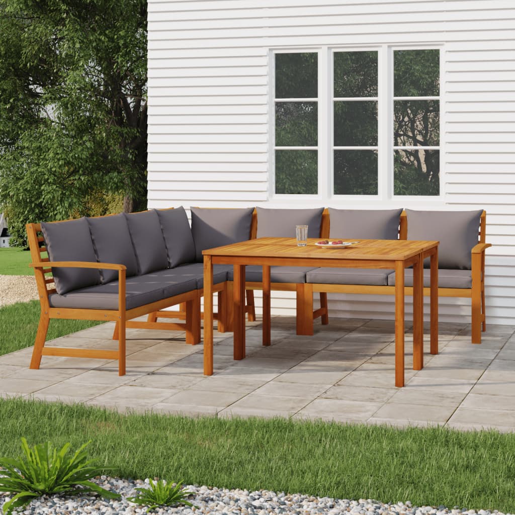 Mit ihrem zeitlosen Design verleiht diese Garten-Essgruppe aus Holz mit Kissen deiner Terrasse oder deinem Garten einen Hauch von rustikalem Charme. Langlebiges Material: Massives Akazienholz ist ein schönes Naturmaterial. Akazienholz ist ein tropisches Hartholz, das dicht, robust und langlebig ist.Stabiles Gestell: Das Holzgestell verleiht der Essgruppe Robustheit und Stabilität.Praktischer Tisch: Der Tisch bietet Platz für Speisen, Getränke und andere Dekoartikel.Modularer Aufbau: Jedes Teil lässt sich leicht umstellen, um je nach Bedarf verschiedene Konfigurationen zu erstellen. In unserem Webshop sind auch andere modulare Möbel mit demselben Design und im gleichem Stil erhältlich, mit denen du dein eigenes Lounge-Set zusammenstellen kannst.Bequemes Sitzerlebnis: Dank der dick gepolsterten Sitz- und Rückenkissen ist die Outdoor-Essgarnitur sehr bequem. Gut zu wissen:Um die Montage so einfach wie möglich zu machen, wird jedes Produkt mit einer Anleitung geliefert. Hinweis:Damit deine Gartenmöbel lange schön bleiben, empfehlen wir dir, sie mit einer wasserdichten Hülle zu schützen.Der Tisch ist niedriger als herkömmliche Esstische und lässt sich besonders gut mit Sofagarnituren kombinieren.
