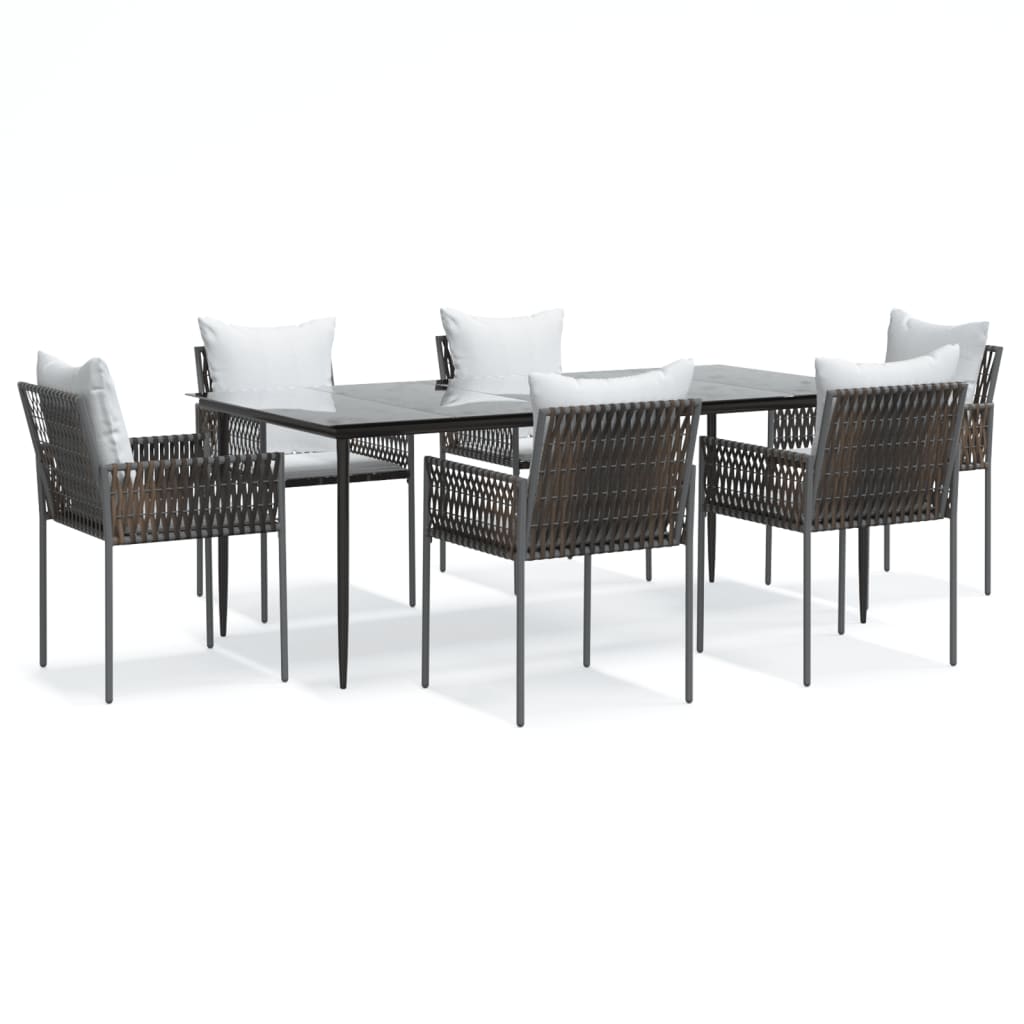 Entspannen Sie sich und genießen Sie einen schönen Nachmittagstee oder eine Mahlzeit mit Ihrer Familie und Freunden rund um dieser Garten-Essgruppe! Langlebiges Material: PE-Rattan, auch als Poly Rattan bekannt, ist witterungsbeständig und pflegeleicht. Seine Oberfläche weist lange Zeit eine ansprechende Optik auf. Es bietet hohe Qualität, Komfort und einen ästhetisches Look.Robuster und stabiler Rahmen: Dank der Stahlrahmen ist die Essgruppe robust, stabil und für den täglichen Einsatz im Freien geeignet.Praktische Tischplatte: Die glatte Tischplatte besteht aus Hartglas, das sich leicht mit einem feuchten Tuch reinigen lässt. Zudem bietet sie den idealen Platz für Speisen, Getränke oder einige dekorative Gegenstände.Bequeme Sitzgelegenheit: Der Essstuhl ist mit einer Rückenlehne und Armlehnen versehen, um höchsten Sitzkomfort zu bieten. Zum hohen Sitzkomfort tragen auch die dick gepolsterten Kissen bei. Hinweis:Damit deine Gartenmöbel lange schön bleiben, empfehlen wir dir, sie mit einer wasserdichten Hülle zu schützen.