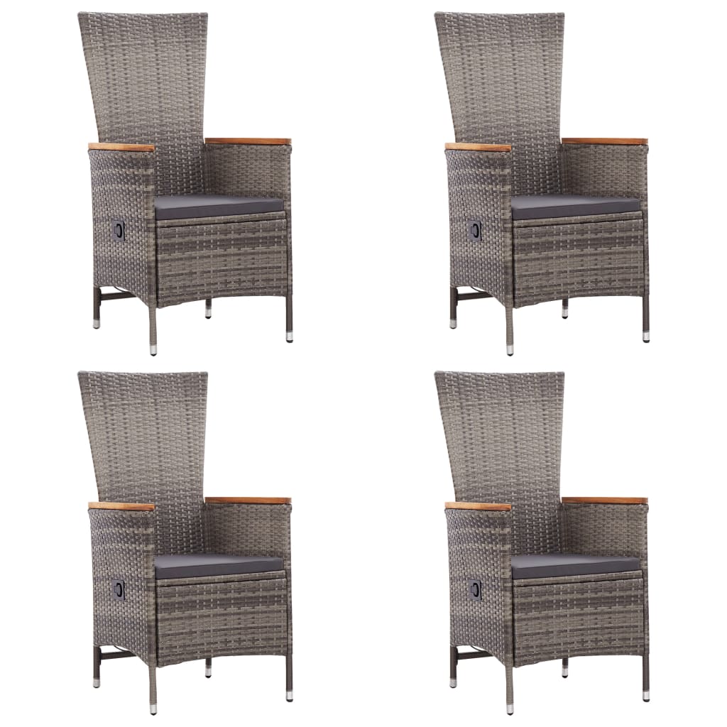 Schaffen Sie mit dieser Garten-Essgruppe eine überzeugende und zusammenhängende Ästhetik in Ihrem Außenbereich! Der Esstisch ist aus massivem Akazienholz gefertigt, was ihn robust und stabil macht. Durch die geölte Oberfläche ist der Holztisch auch für den Außenbereich geeignet. Mit einem Stahlrahmen, der mit witterungsbeständigem PE-Rattan geflochten ist, sind die Esszimmerstühle robust und leicht zu reinigen. Die Armlehnen sind wunderschön mit massivem Akazienholz verziert, was einen rustikalen Charme versprüht. Durch Ziehen des seitlichen Knopfes kann die Rückenlehne nach hinten und die Fußstütze gleichzeitig nach oben verstellt werden. Die dick gepolsterten Kissen sorgen zudem für zusätzlichen Sitzkomfort beim Faulenzen. Hinweis: Um die Lebensdauer Ihrer Gartenmöbel zu verlängern, empfehlen wir Ihnen, diese regelmäßig zu reinigen und bei Nichtgebrauch im Freien abzudecken.Reinigung: Verwenden Sie eine milde Seifenlösung.Lagerung: Wenn möglich, an einem kühlen, trockenen Ort im Innenbereich lagern. Wenn das Produkt im Freien gelagert wird, schützen Sie es mit einer wasserdichten Abdeckung. Wischen und trocknen Sie das überschüssige Wasser oder den Schnee nach Regen oder Schneefall von der ebenen Fläche. Sorgen Sie für eine ausreichende Luftzirkulation, um feuchtigkeitsbedingte Schäden zu vermeiden.