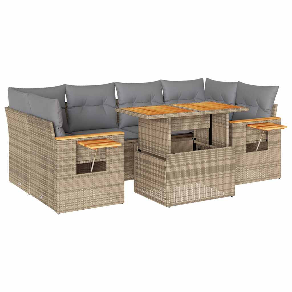 Diese Garten-Sofagarnitur ist die perfekte Ergänzung zu deinem Garten, deiner Terrasse oder deinem Innenhof. Sie bietet einen bequemen und einladenden Platz, um mit Familie und Freunden zu plaudern oder dich einfach nur zu entspannen und das Leben im Freien zu genießen.Langlebiges Material: PE-Rattan, auch als Poly Rattan bekannt, ist ein robustes, pflegeleichtes synthetisches Material, das die Optik von natürlichem Rattan aufweist. Es kennzeichnet sich durch ein geringes Eigengewicht und lässt sich einfach reinigen. Aufgrund seiner Haltbarkeit und Witterungsbeständigkeit wird es häufig bei der Herstellung von Gartenmöbeln verwendet.Stauraum mit wasserfestem Beutel: Jedes Gartensofa verfügt über ein Staufach unter der Sitzfläche, das mit einem wasserfesten Beutel zur Aufbewahrung von Kissen, Spielzeug und anderen Gegenständen versehen ist. Die Kissen sind mit Bezügen versehen und lassen sich mit Klettverschlüssen fest und sicher an den Sofas befestigen.Praktische Ablage: Dieses Gartensofa verfügt über eine klappbare Ablage mit Gasfeder, auf der du verschieden Sachen griffbereit aufbewahren kannst.Abnehmbarer und waschbarer Bezug: Diese Sitzkissen verfügen über abnehmbare Bezüge für einfaches Waschen und Pflegen.Modulares Design: Dank des modularen Designs lassen sich die Gartenmöbel völlig flexibel und einfach umstellen, um deinen Außenbereich ganz individuell zu gestalten.Gut zu wissen:Wir empfehlen dir, deine Gartenmöbel mit einer wasserdichten Hülle zu schützen, um lange Zeit eine ansprechende Optik aufzuweisen.