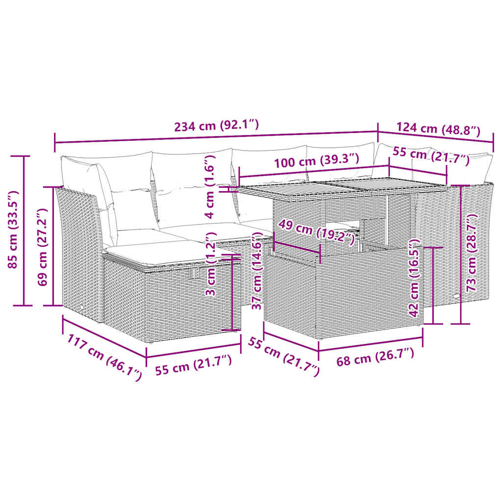 Diese Garten-Sofagarnitur ist die perfekte Ergänzung zu deinem Garten, deiner Terrasse oder deinem Innenhof. Sie bietet einen bequemen und einladenden Platz, um mit Familie und Freunden zu plaudern oder dich einfach nur zu entspannen und das Leben im Freien zu genießen.Langlebiges Material: PE-Rattan, auch als Poly Rattan bekannt, ist ein robustes, pflegeleichtes synthetisches Material, das die Optik von natürlichem Rattan aufweist. Es kennzeichnet sich durch ein geringes Eigengewicht und lässt sich einfach reinigen. Aufgrund seiner Haltbarkeit und Witterungsbeständigkeit wird es häufig bei der Herstellung von Gartenmöbeln verwendet.Stauraum mit wasserfestem Beutel: Jedes Gartensofa verfügt über ein Staufach unter der Sitzfläche, das mit einem wasserfesten Beutel zur Aufbewahrung von Kissen, Spielzeug und anderen Gegenständen versehen ist. Die Kissen sind mit Bezügen versehen und lassen sich mit Klettverschlüssen fest und sicher an den Sofas befestigen.Abnehmbarer und waschbarer Bezug: Diese Sitzkissen verfügen über abnehmbare Bezüge für einfaches Waschen und Pflegen.Modulares Design: Dank des modularen Designs lassen sich die Gartenmöbel völlig flexibel und einfach umstellen, um deinen Außenbereich ganz individuell zu gestalten.Gut zu wissen:Wir empfehlen dir, deine Gartenmöbel mit einer wasserdichten Hülle zu schützen, um lange Zeit eine ansprechende Optik aufzuweisen.