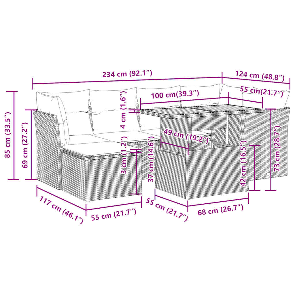 Diese Garten-Sofagarnitur ist die perfekte Ergänzung zu deinem Garten, deiner Terrasse oder deinem Innenhof. Sie bietet einen bequemen und einladenden Platz, um mit Familie und Freunden zu plaudern oder dich einfach nur zu entspannen und das Leben im Freien zu genießen. Langlebiges Material: PE-Rattan, auch als Poly Rattan bekannt, ist ein robustes, pflegeleichtes synthetisches Material, das die Optik von natürlichem Rattan aufweist. Es kennzeichnet sich durch ein geringes Eigengewicht und lässt sich einfach reinigen. Aufgrund seiner Haltbarkeit und Witterungsbeständigkeit wird es häufig bei der Herstellung von Gartenmöbeln verwendet.Stauraum mit wasserfestem Beutel: Jedes Gartensofa verfügt über ein Staufach unter der Sitzfläche, das mit einem wasserfesten Beutel zur Aufbewahrung von Kissen, Spielzeug und anderen Gegenständen versehen ist. Die Kissen sind mit Bezügen versehen und lassen sich mit Klettverschlüssen fest und sicher am Sofa befestigen.Verstellbare Tischplatte: Die Tischplatte lässt sich anheben, um den Gartentisch höher zu machen und ihn von einem Couchtisch in einen Esstisch zu verwandeln. Er eignet sich daher perfekt für Gäste oder Mahlzeiten im Freien.Vielseitiger Fußhocker: Der Hocker ist vielseitig einsetzbar und dient als bequeme Fußstütze beim Entspannen auf dem Sofa oder als zusätzlicher Sitzplatz in deinem Garten.Abnehmbarer und waschbarer Bezug: Diese Sitzkissen verfügen über abnehmbare Bezüge für einfaches Waschen und Pflegen.Robustes und stabiles Gestell: Der pulverbeschichtete Stahlgestell ist stark, stabil, langlebig sowie korrosions- und wetterbeständig, um eine lang anhaltende Leistung zu gewährleisten. Gut zu wissen:Wir empfehlen dir, deine Gartenmöbel mit einer wasserdichten Hülle zu schützen, um lange Zeit eine ansprechende Optik aufzuweisen.