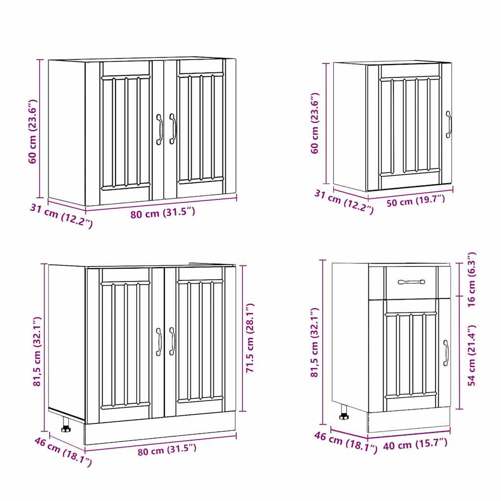 Diese 7-teilige Küchenzeile mit elegantem Design optimiert Ihren Küchenraum und bietet ausreichend Stauraum für Ihre Sachen! Starkes und langlebiges Material: Holzwerkstoff ist ein langlebiges und robustes Material mit einer glatten Oberfläche, das gegen Feuchtigkeit, Verformung und Rissbildung beständig ist, wodurch es eine zuverlässigen Wahl für die Herstellung von Möbeln ist.Viel Stauraum: Das Küchenschrank-Set hat viele Fächer und bietet ausreichend Platz für Schüsseln, Teller, Töpfe und andere Küchengeräte.Verstellbare Füße: Die Unterschränke sind mit verstellbaren Füßen ausgestattet, die sich in der Höhe an deine Kücheneinrichtung anpassen lassen.Pflegeleicht: Dank der glatten Oberfläche lassen sich diese Küchenschränke leicht mit einem feuchten Tuch reinigen und benötigen weniger Pflege. Achtung:Um ein Umkippen zu vermeiden, sollte dieses Produkt mit der mitgelieferten Wandhalterung gesichert werden. Gut zu wissen:Schrauben und Dübel für die Wandbefestigung sind nicht enthalten. Suchen und verwenden Sie die für Ihre Wände geeigneten Schrauben und Dübel. Wenn Sie unsicher sind, suchen Sie professionelle Hilfe. Lesen und befolgen Sie jeden Schritt der Anleitung sorgfältig.Die Arbeitsplatte, das Spülbecken und der Wasserhahn sind nicht im Lieferumfang enthalten.