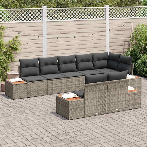 Das Garten-Sofa-Set schafft eine stylische und einladende Atmosphäre, perfekt für entspannte Stunden mit Familie oder Freunden. Die Kombination aus grauem Poly-Rattan und passenden Kissen vereint Komfort und Langlebigkeit, egal ob es regnet oder die Sonne scheint. Das modulare Garten-Sofa-Set ermöglicht es dir, die Anordnung super einfach zu verändern, passend für jede Außenfläche, sei es Terrasse, Balkon oder Garten. Hergestellt aus UV-beständigem Poly-Rattan, sieht dieses Möbelstück das ganze Jahr über toll aus, damit du lange Freude daran hast. Jedes Kissen ist mit weichem Schaum gefüllt und in wetterbeständigem Stoff eingehüllt. Sie bieten einen bequemen Platz zum Relaxen und sind abnehmbar für eine einfache Reinigung. Das Set hat clevere Stauraumfächer in den Sitzpolstern, um deinen Außenbereich ordentlich zu halten und Kissen oder andere Dinge sicher zu verstauen. Mit Platz für bis zu 8 Personen ist dieses Set ideal zum Entspannen oder Feiern mit deinen liebsten Freunden und Familie.