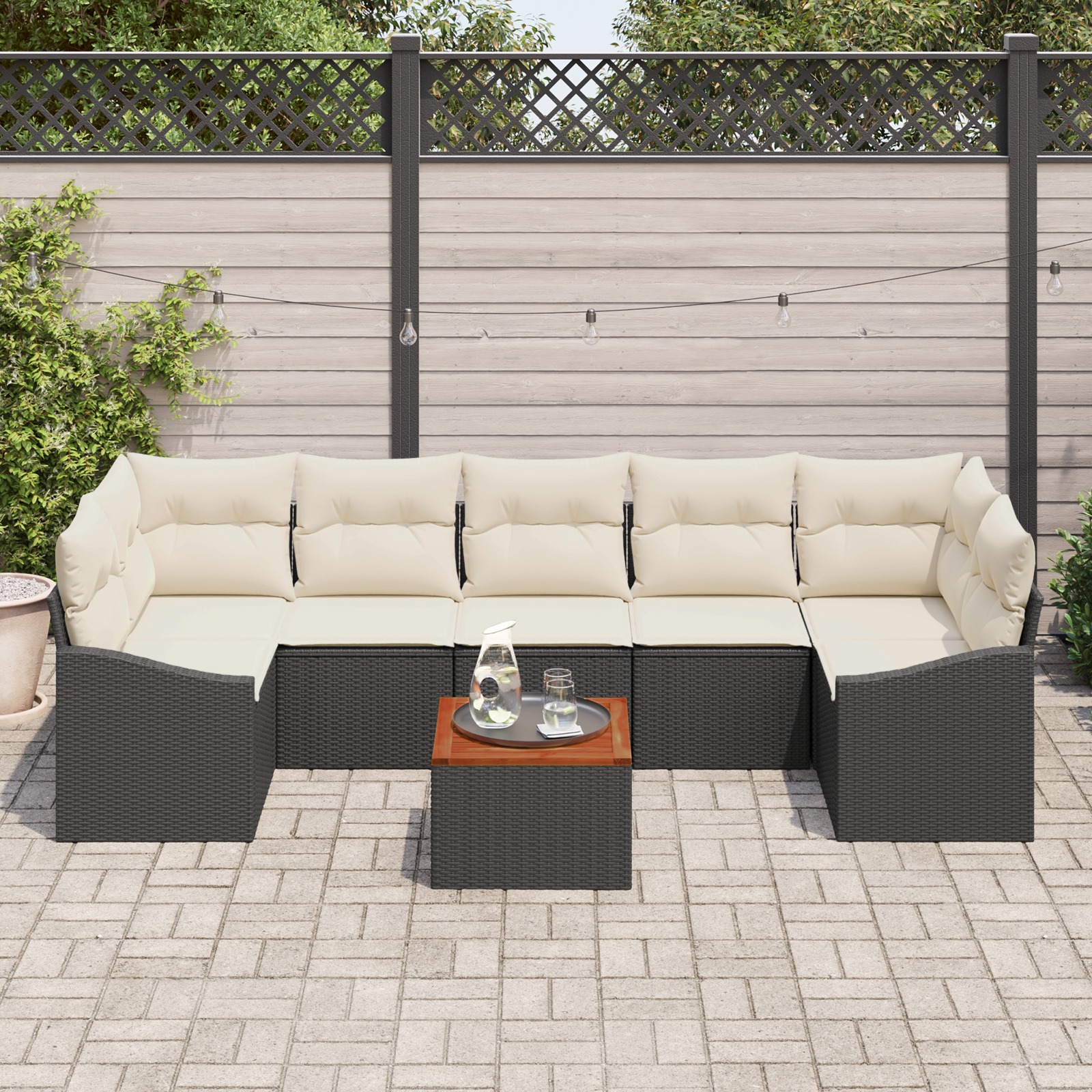Dieses Garten Sofa Set verbindet modernes Design mit praktischer Nutzung und ist ein absolutes Must-Have für deine Außenmöbel. Es hat ein cooles schwarzes Poly Rattan Gestell und bequeme weiße Kissen aus farbecht und sonnenbeständigem Polyester, die einfach zum Entspannen einladen und perfekt in dein Balkon- oder Gartendesign passen. Modulares Design: Mit diesem Sofa Set kannst du die Anordnung nach deinen Wünschen gestalten. Ideal für Grillpartys oder gemütliche Abende; so hat jeder einen bequemen Platz. Atemaktives Material: Die Kissen sind aus atmungsaktivem Stoff, der für eine gute Luftzirkulation sorgt und dich an warmen Tagen angenehm kühl hält. Genieße das Outdoor-Vergnügen ohne Unannehmlichkeiten. Stabile Konstruktion: Mit einem starken Rahmen aus pulverbeschichtetem Stahl und robustem Poly Rattan ist dieses Set dafür gemacht, im Freien langlebig zu sein und dabei gut auszusehen. Du kannst dir sicher sein, dass es lange hält. Vielseitige Verwendung: Perfekt für den Außenbereich, egal ob zum Essen oder für entspannte Treffen, dieses Garten Sofa Set ist eine tolle Wahl für Partys oder einfach, um ein Buch zu lesen. Es passt zu jedem Anlass, sei es eine Gartenparty oder ein ruhiger Rückzugsort. Genügend Platz: Das Sofa Set bietet Platz für bis zu sieben Erwachsene und ist super für größere Zusammenkünfte. Genieß eine großzügige Anordnung, die das Gastgeben einfach und angenehm macht.