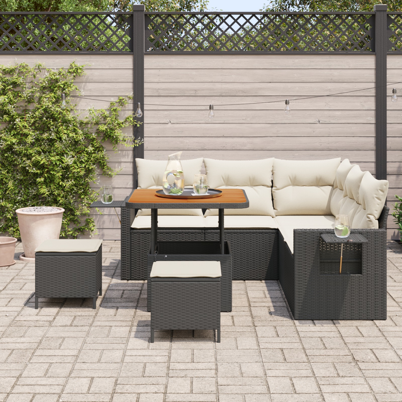 Dieses 8-teilige Garten Sofa Set in Schwarz und Creme Weiß vereint modernen Stil mit Komfort – genau das Richtige für deinen Außenbereich. Die klaren Linien und einladenden Farben schaffen die perfekte Atmosphäre für eine tolle Zeit auf deinem Balkon oder Patio, ideal zum Entspannen oder für einen Besuch von Freunden. Robuste Konstruktion: Hergestellt aus UV-beständigen Materialien, die den äußeren Bedingungen standhalten und deren Farben lebendig bleiben. Flexible Sitzmöglichkeiten: Platz für bis zu sechs Personen – ideal für Familientreffen oder gesellige Abende. Bequeme Kissen: Abnehmbare Bezüge machen die Reinigung nach Feiern ganz einfach. Der strapazierfähige Stoff sorgt für zusätzlichen Komfort an langen Outdoor-Abenden. Eleganter Tisch: Ein stilvoller Couchtisch mit echter Holzoberfläche – perfekt für Getränke und Snacks und sieht dabei auch noch klasse aus. Großzügige Dimensionen: Mit viel Sitzplatz und einem geräumigen Tisch verbessert dieses Set dein Outdoor-Erlebnis, ob beim Essen oder einfach zum Entspannen.