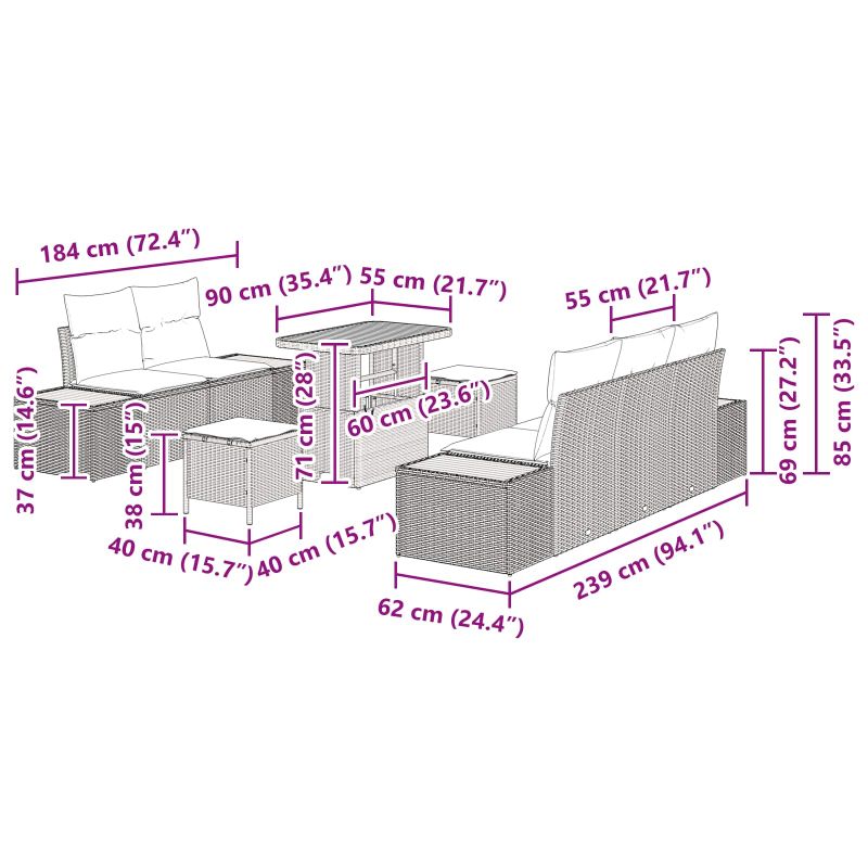 Dieses Garten-Sofa-Set ist ganz auf Stil und Komfort ausgelegt, um dir ein unvergessliches Erlebnis im Freien zu bieten. Mit seinem eleganten Design und flexiblen Modulen passt es perfekt zu Terrassen, Balkonen oder Gärten und bringt einen modernen Touch in deinen Außenbereich, während es für viel Platz bei geselligen Treffen sorgt. Modulare Sitzplätze: Das Sofa-Design erlaubt es dir, die Teile nach Belieben zu gestalten, perfekt für Partys oder entspannte Zeiten. Gepolsterter Komfort: Jeder Sitz hat bequeme Kissen, die in wetterfestem Polyester eingekleidet sind, ideal, um deinen Morgenkaffee zu genießen oder Freunde einzuladen. Langlebigkeit: Hergestellt aus Poly-Rattan und pulverbeschichtetem Stahl, bleibt dieses Set schick und witterungsbeständig. Einfach zu pflegen: Die abnehmbaren Kissenbezüge mit Reißverschluss lassen sich leicht reinigen, damit dein Set immer frisch und einladend aussieht. Verstellbare Füße: Mit verstellbaren Füßen, um unebene Flächen auszugleichen und dir Stabilität und Komfort zu geben, egal wo du es hinstellst.