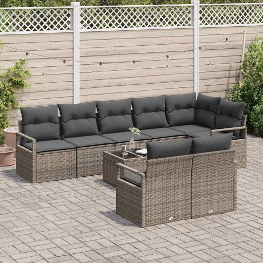 Dieses Outdoor-Sofaset vereint modernen Stil mit Praktikabilität und ist perfekt geeignet, um jede Terrasse oder jeden Garten aufzuwerten. Mit seinen modularen Teilen kannst du das Set so anordnen, dass es in deinen Raum passt, und es wird zum einladendsten Ort, um mit Freunden und Familie eine Mahlzeit zu genießen oder einfach zu relaxen. Dieses Set hat ein modulares Design für anpassbare Anordnungen, sodass du es einfach an jeden Außenbereich anpassen kannst. Die einzelnen Teile lassen sich umstellen, um Versammlungen unterschiedlicher Größe zu ermöglichen, egal ob für ein schickes Abendessen oder ein entspanntes Barbecue. Handgewebt aus synthetischem Rattan, ist der Rahmen auf Langlebigkeit und wenig Pflege ausgelegt. Diese Handwerkskunst sorgt nicht nur für Haltbarkeit, sondern fügt auch ein elegantes Aussehen hinzu, das jede Außenumgebung aufwertet. Die im Set enthaltenen Kissen sind aus wetterbeständigem Polyester und bieten hohen Komfort. Sie sind mit Reißverschlüssen versehen, was die Entnahme und Reinigung erleichtert, damit du immer ein frisches Aussehen bewahren kannst. Die ansprechende graue Farbkombination schafft eine stilvolle und moderne Silhouette, die zu vielen verschiedenen Außenstilen passt. Dieser schwungvolle Farbton fügt sich nahtlos in jede Garten- oder Terrassendekoration ein und hebt dein Outdoor-Erlebnis hervor. Die Montage ist einfach, damit du dein neues Wohnzimmer im Freien schnell genießen kannst. Das Sofaset kommt mit allen notwendigen Teilen und einer detaillierten Anleitung, sodass es zwei Personen in kurzer Zeit zusammenbauen können.