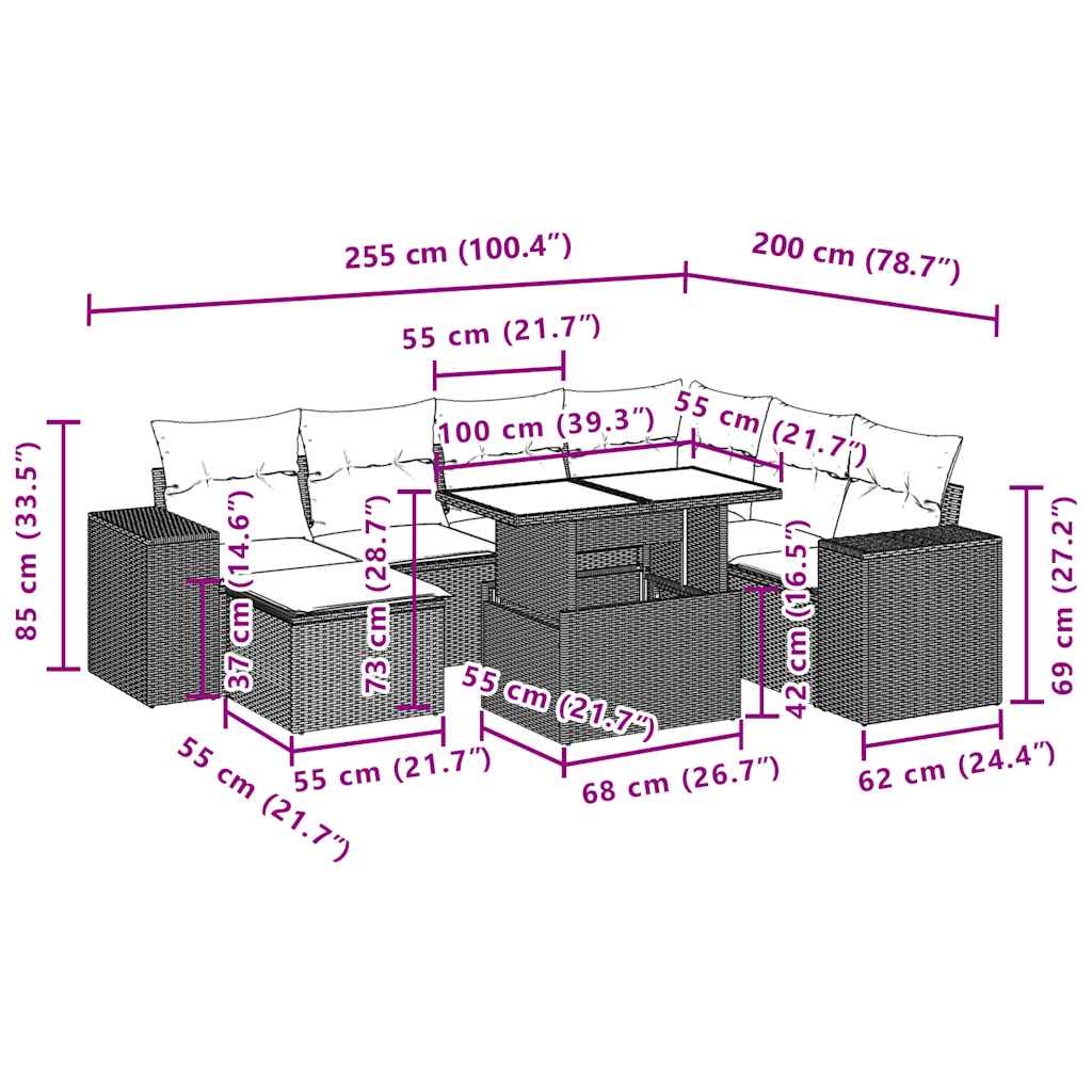Dieses Gartensofa-Set ist die perfekte Ergänzung für Ihren Garten, Ihre Terrasse oder Ihren Innenhof und bietet einen komfortablen und einladenden Platz zum Plaudern mit Familie und Freunden oder einfach zum Entspannen und Genießen der Natur. Langlebiges Material: PE-Rattan, auch bekannt als Polyrattan, ist ein robustes, pflegeleichtes Kunststoffmaterial, das wie natürliches Rattan aussieht. Es ist leicht, einfach zu reinigen und wird aufgrund seiner Langlebigkeit und Wetterbeständigkeit häufig für Gartenmöbel verwendet.Verstellbare Tischplatte: Die Tischplatte kann angehoben werden, um den Tisch höher zu stellen, wodurch der Gartentisch von einem Couchtisch in einen Esstisch verwandelt wird. Es ist perfekt, um Gäste zu empfangen oder draußen zu essen.Bequemes Sitzerlebnis: Diese Gartenmöbel mit dick gepolsterten Kissen bieten ein bequemes Sitzerlebnis.Abnehmbarer und waschbarer Bezug: Diese Sitzkissen verfügen über abnehmbare Bezüge zum einfachen Waschen und Pflegen.Modulares Design: Dieses Gartenmöbelset hat ein modulares Design, wodurch es völlig flexibel und leicht zu bewegen ist, sodass Sie eine individuelle Gartenmöbelanordnung erstellen können. Gut zu wissen:Damit Ihre Gartenmöbel schön bleiben, empfehlen wir Ihnen, sie mit einer wasserdichten Abdeckung zu schützen.