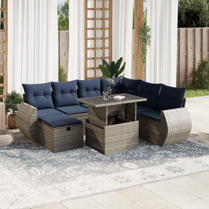 Dieses Gartensofa-Set ist die perfekte Ergänzung für Ihren Garten, Ihre Terrasse oder Ihren Innenhof und bietet einen komfortablen und einladenden Platz zum Plaudern mit Familie und Freunden oder einfach zum Entspannen und Genießen der Natur. Langlebiges Material: PE-Rattan, auch bekannt als Polyrattan, ist ein robustes, pflegeleichtes Kunststoffmaterial, das wie natürliches Rattan aussieht. Es ist leicht, einfach zu reinigen und wird aufgrund seiner Langlebigkeit und Wetterbeständigkeit häufig für Gartenmöbel verwendet.Verstellbare Tischplatte: Die Tischplatte kann angehoben werden, um den Tisch höher zu machen, wodurch der Gartentisch von einem Couchtisch in einen Esstisch verwandelt wird. Er eignet sich perfekt, um Gäste einzuladen oder draußen zu essen.Glastischplatte: Die Tischplatte des Gartentisches besteht aus starkem und langlebigem Hartglas, sodass sie sich leicht mit einem feuchten Tuch reinigen lässt und Ihrem Außenbereich einen Hauch von Eleganz verleiht.Abnehmbarer und waschbarer Bezug: Diese Sitzkissen verfügen über abnehmbare Bezüge, die sich leicht waschen und pflegen lassen.Modulares Design: Dieses Gartenmöbelset hat ein modulares Design, wodurch es völlig flexibel und leicht zu bewegen ist, sodass Sie eine individuelle Gartenmöbelanordnung erstellen können. Gut zu wissen:Damit Ihre Gartenmöbel schön bleiben, empfehlen wir Ihnen, sie mit einer wasserdichten Abdeckung zu schützen.