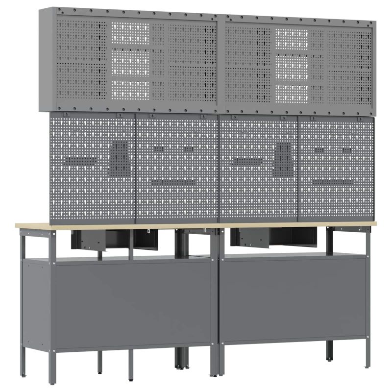 Dieses Werkzeugaufbewahrung Werkbank Set bringt Stil und Funktion zusammen und ist ein Muss für jeden ernsthaften DIYer oder Handwerker. Der robuste Stahl und das clevere Design bieten dir einen aufgeräumten Arbeitsplatz, der Produktivität und Effizienz steigert. Robuste Bauweise: Werkbank und Teile bestehen aus hochwertigem Stahl, also sind sie für harte Einsätze gebaut und halten lange. Du kannst dich darauf verlassen, dass alles sicher verstaut ist. Viel Stauraum: Mit 8 Aufbewahrungsfächern hast du viel Platz für Werkzeuge gleich zur Hand. Ein aufgeräumter Raum sorgt für effektives Arbeiten. Praktisches Design: Das durchdachte Layout erleichtert das Greifen aller benötigten Werkzeuge. Die Pegboards und Schränke ermöglichen schnellen Zugriff, sodass deine Werkzeuge immer ordentlich verstaut sind. Nur für drinnen: Ideal für Werkstätten und Garagen, ist dieses Werkbank Set robust genug für den täglichen Einsatz. Schaffe Ordnung in deinem Arbeitsplatz mit dieser zuverlässigen Aufbewahrungslösung. Stylisches Design: Mit einer eleganten, matten grauen und schwarzen Oberfläche bietet dieses Werkbank Set praktische Funktionalität und verleiht deinem Raum einen Hauch von modernem Industriecharme.