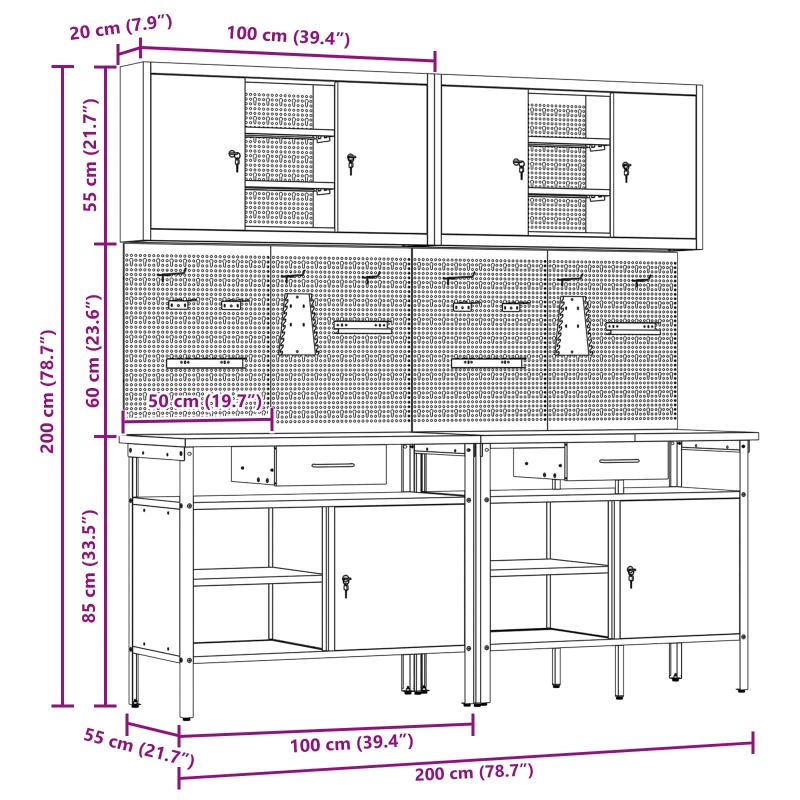 - Lieferumfang: 2 Bänke (100 cm) + 4 Pegboards (60 cm) + 2 Schränke mit Pegboard (100 cm)