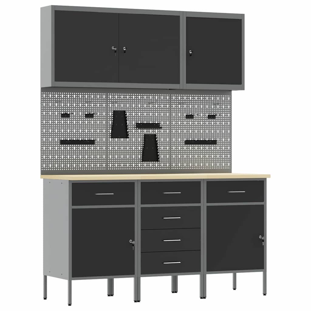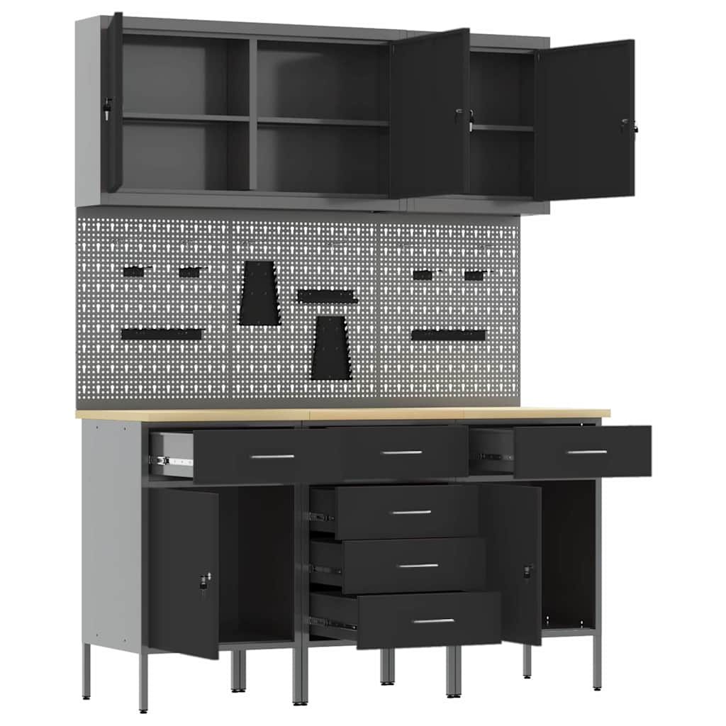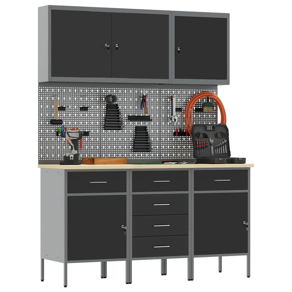 - Lieferumfang: 2 x Werkbank (mit 1 Tür und 1 Schublade), 1 x Werkbank (mit 4 Schubladen), 3 x Werkzeugwandpaneel, 1 x Werkzeugschrank (mit 1 Tür), 1 x Werkzeugschrank (mit 2 Türen)