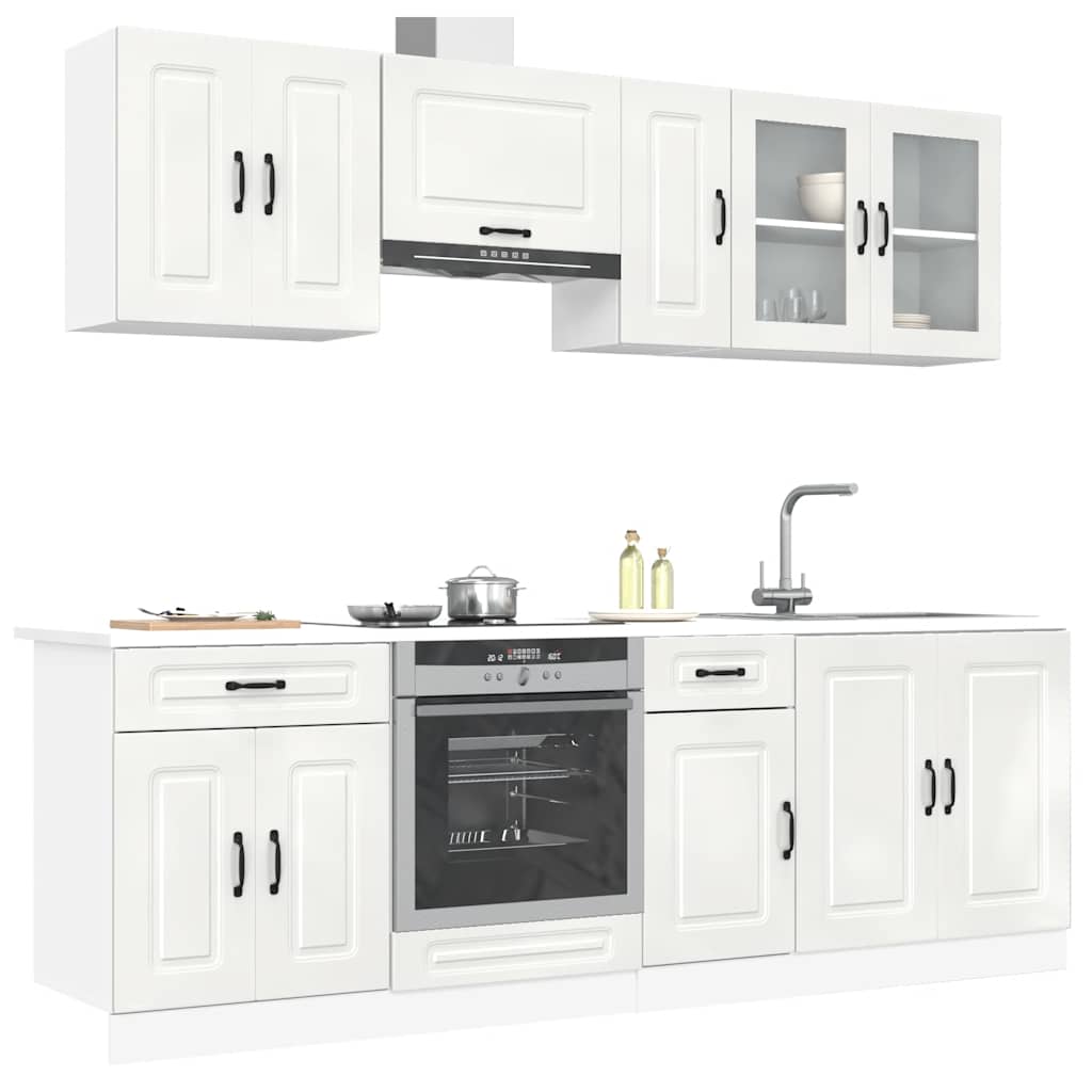 Mit ihrem eleganten Design optimiert diese 8-teilige Küchenzeile Ihre Küche und bietet reichlich Platz für Ihre Küchenausstattung! Starkes und langlebiges Material: Holzwerkstoff ist ein langlebiges und robustes Material mit einer glatten Oberfläche, das gegen Feuchtigkeit, Verformung und Rissbildung beständig ist, wodurch es eine zuverlässigen Wahl für die Herstellung von Möbeln ist.Viel Stauraum: Das Küchenschrank-Set hat viele Fächer und bietet ausreichend Platz für Schüsseln, Teller, Töpfe und andere Küchengeräte.Verstellbare Füße: Die Unterschränke sind mit verstellbaren Füßen ausgestattet, die sich in der Höhe an deine Kücheneinrichtung anpassen lassen.Pflegeleicht: Dank der glatten Oberfläche lassen sich diese Küchenschränke leicht mit einem feuchten Tuch reinigen und benötigen weniger Pflege. Achtung:Um ein Umkippen zu vermeiden, sollte dieses Produkt mit der mitgelieferten Wandhalterung gesichert werden. Gut zu wissen:Schrauben und Dübel für die Wandbefestigung sind nicht enthalten. Suchen und verwenden Sie die für Ihre Wände geeigneten Schrauben und Dübel. Wenn Sie unsicher sind, suchen Sie professionelle Hilfe. Lesen und befolgen Sie jeden Schritt der Anleitung sorgfältig.Die Arbeitsplatte, das Spülbecken und der Wasserhahn sind nicht im Lieferumfang enthalten.