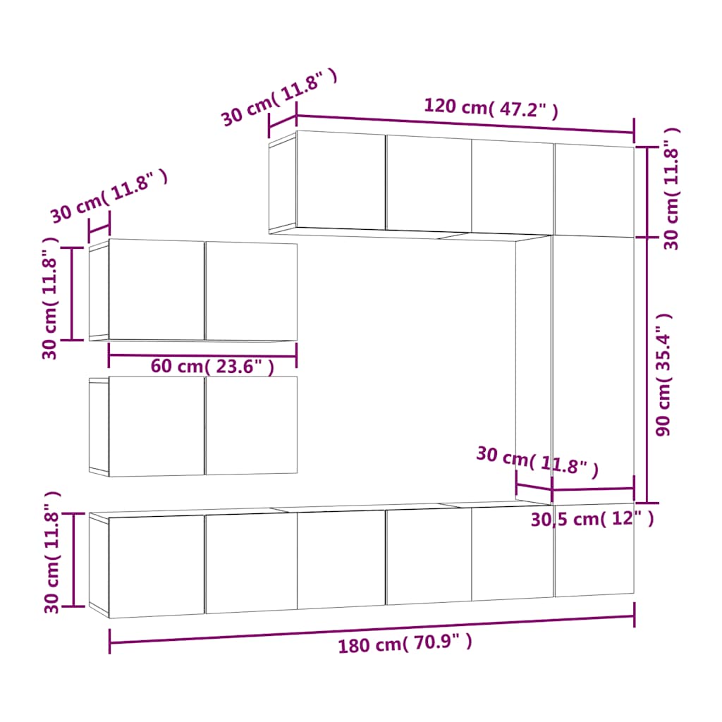 - TV-Schrank (mit 2 Türen): 60 x 30 x 30 cm (B x T x H)